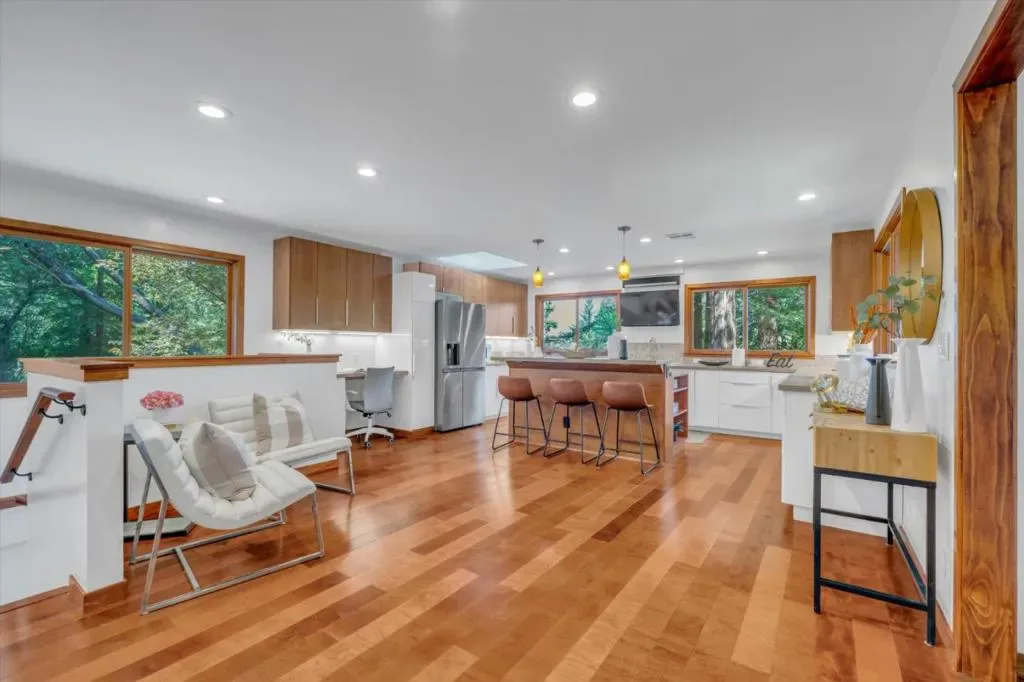 Set on 2.6+ wooded acres in the hills, this warm & beautifully renovated home offers something genuinely rare on the Peninsula: complete privacy amid towering redwood trees, a profound sense of forest immersion, and less than 15 minutes to Sand Hill & 280. The updated & open floor plan kitchen flows into generous dining and living spaces, all oriented towards sweeping forest views. Natural light fills the space, and wraparound decks extend living outdoors, with a hot tub just off the primary suite. A flexible two bedroom wing can accommodate children, teens, guest rooms, or office and studio space. An independent 1-bdrm ADU with its own kitchen / bath is ideal for rental income, an au pair, or an aging parent. The kitchen, secondary bathrooms, finishes, HVAC, roof, and water heater – have all been recently renovated, and pre-sale inspections were completed with virtually all items addressed. Hiking, cycling & equestrian trails connect directly to the property, and the land is zoned for horses. Stanford’s campus is a short, predictable 25 min commute away. Zoned for Portola Valley El / Mid schools and Woodside HS, with several excellent private schools nearby. Soaring redwoods, architectural warmth & effortless access to the heart of Silicon Valley – come see it for yourself.