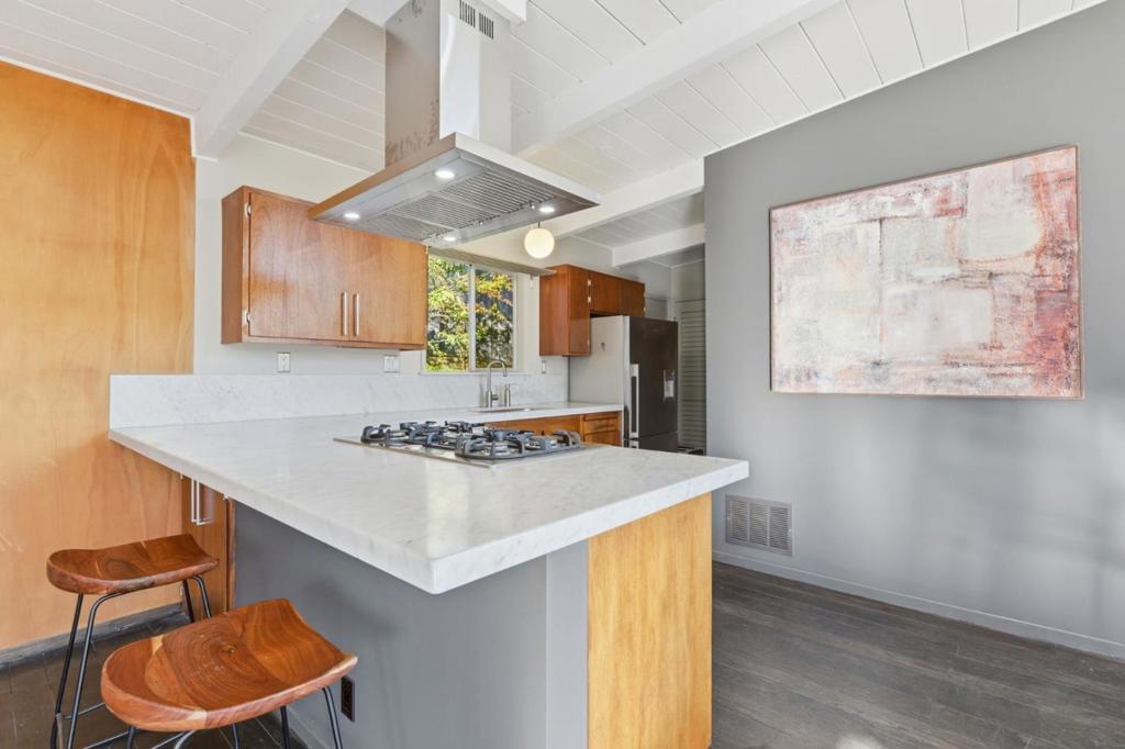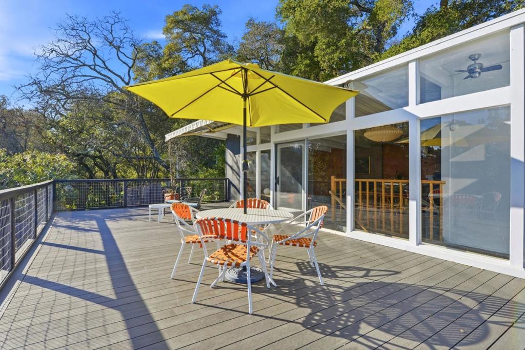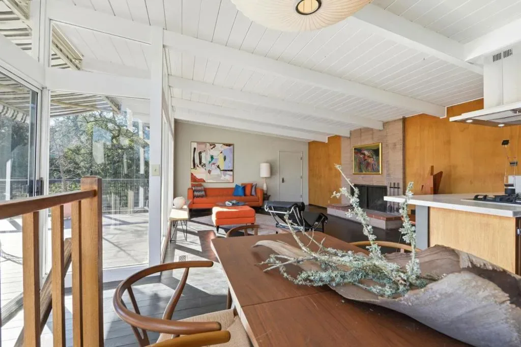 Mid-Century Modern enthusiasts will be delighted by this truly special Woodside retreat. Nestled in The Glens and surrounded by trees, this home sits atop an expansive preserve with access to hiking trails. Built in 1959, the home showcases iconic mid-century design with floor to ceiling glass that fills the upper level with natural light and opens to an expansive 900+ sq ft deck, seamlessly blending indoor-outdoor living and creating an ideal setting for entertaining. The modern kitchen is thoughtfully appointed with Carrara marble countertops and premium stainless steel appliances, including Bertazzoni, Viking, and Fisher & Paykel. The upper level features a spacious living room with fireplace, a motorized awning for the deck along with two bedrooms and a full bath. The lower level offers a versatile family room, generous storage, and carport access. The primary suite provides a peaceful retreat with its own bathroom and direct access to a secluded patio, perfect for relaxing among the natural surroundings. Other features and updates within the last year include a new roof, new deck, new A/C, new landscaping and a new driveway. A rare opportunity to enjoy timeless architecture, privacy, and the beauty of nature.