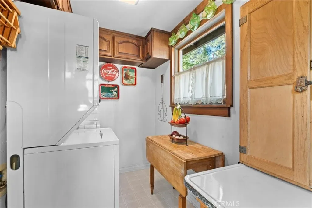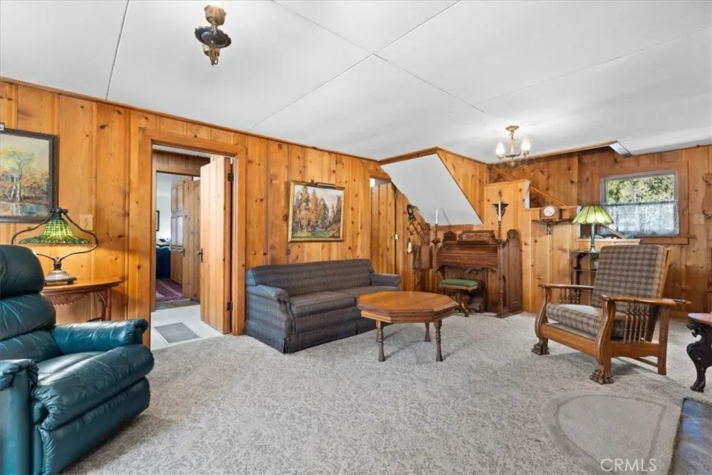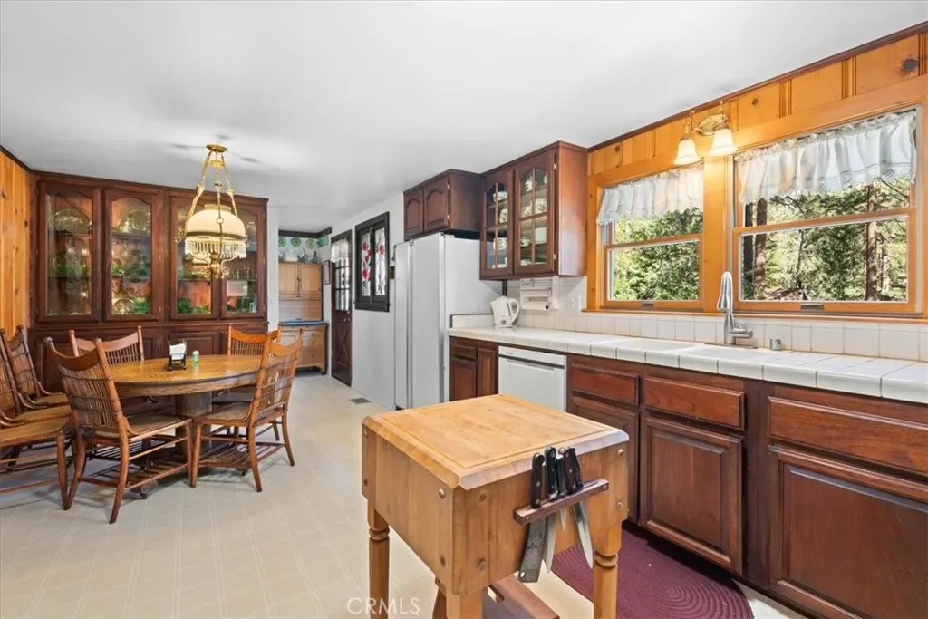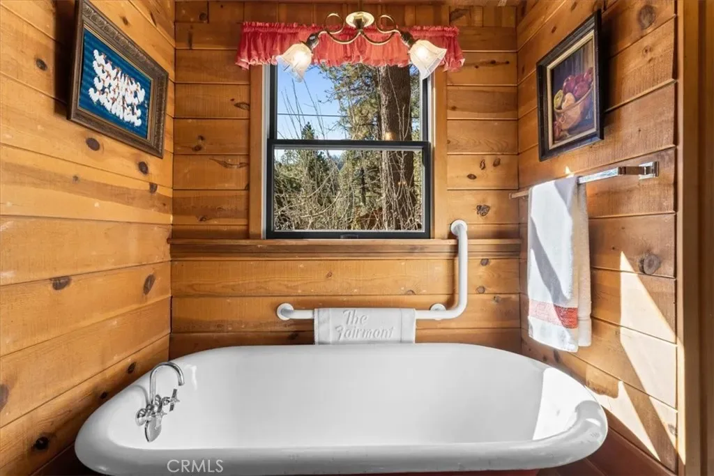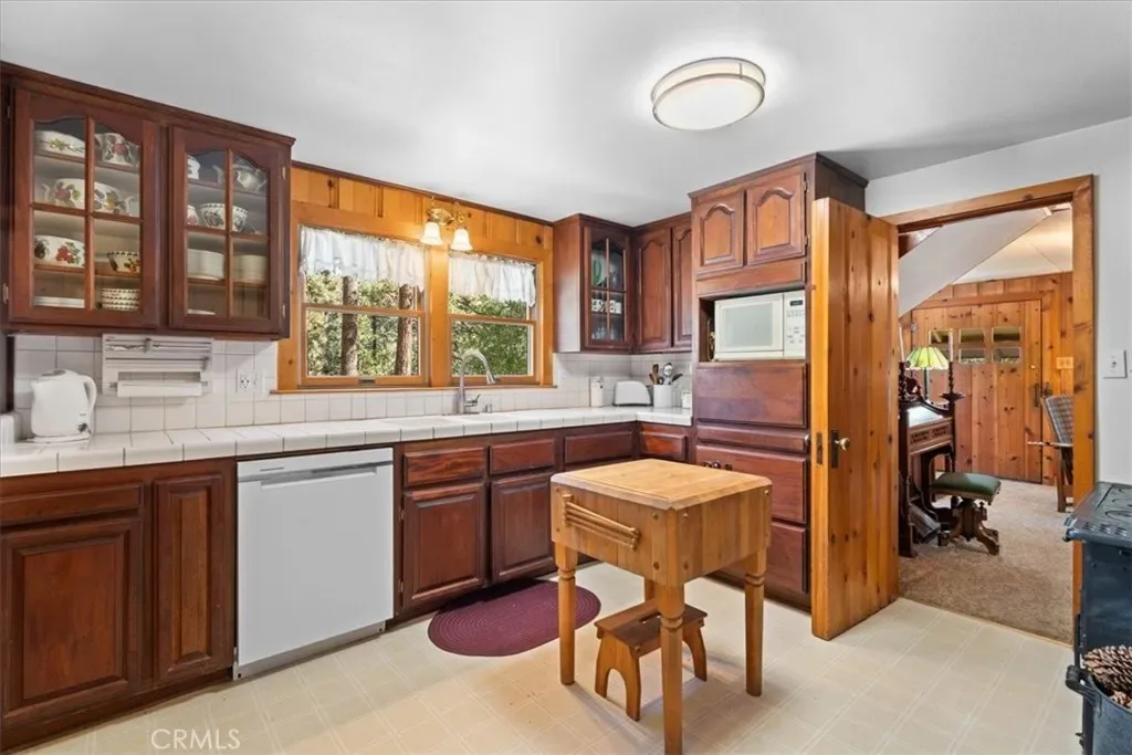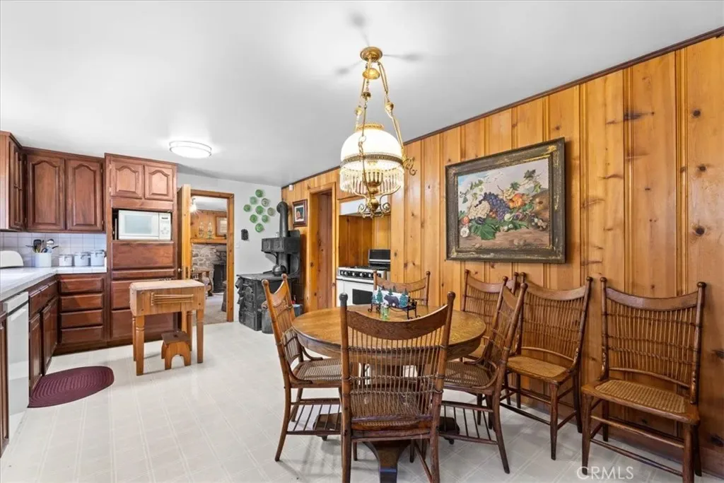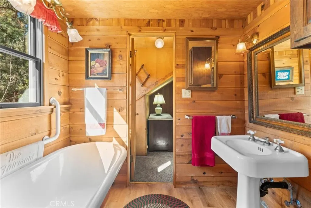 is sure to please. Originally constructed in 1932 by master craftsmen, the house is on an elevated corner lot perfectly situated to offer easy walking options to the lake and quaint village, views of the mountains, and a park like setting that offers peace and tranquility. Inside, the large custom front door provides a grand entry to a large living room with a native rock fireplace. Knotty pine tongue and groove material adorns the walls in authentic mountain style. The large country kitchen is fully equipped with dishwasher, gas range, and ample counter space for holiday meals or just the weekend round of flapjacks. The kitchen also includes a functional antique cast iron cook stove. The indoor laundry is conveniently located around the corner, along with main floor bedroom and remodeled bathroom, bringing form and function together seamlessly. The newly-remodeled bathroom features a glass enclosed shower and hand made Moroccan Zellige tile. All interior doors have been button built and offer excellent craftsmanship. Upstairs, the wide staircase and landing lead to two more bedrooms, each with plenty of room and offering tree top views of the natural Jeffrey and Ponderosa pines. Upstairs is also where you will find the second bathroom, with the highlight being the majestic claw foot soaking tub and new vinyl plank flooring. Other modern updates in the house include dual pane windows, forced air central heat, and alarm system. Outside, the sturdy covered front porch with native log support beams is your zen zone and a perfect opportunity to relax and watch the birds and squirrels, all while enjoying the four seasons. The side patio area offers fenced garden beds and access to the many fruit trees, lilacs and other plants that adorn the garden. The landscaping is watered with a full system of automatic sprinklers. Down in the garage is a soft water system and forced air furnace. This once in a lifetime opportunity will not last long, so come take a look before it is locked up by another family for another 100 years!!