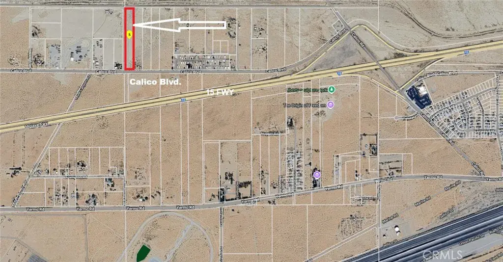 Exceptional opportunity to own 5.43 acres of flat, buildable land with direct frontage on paved Calico Blvd in Yermo. Strategically located just off the Calico Rd exit from Interstate 15, this parcel benefits from high visibility and traffic exposure from millions of travelers heading to and from Las Vegas each week. Ideal for future development or investment, this lot offers convenient access and flexible RL (Rural Living) zoning.