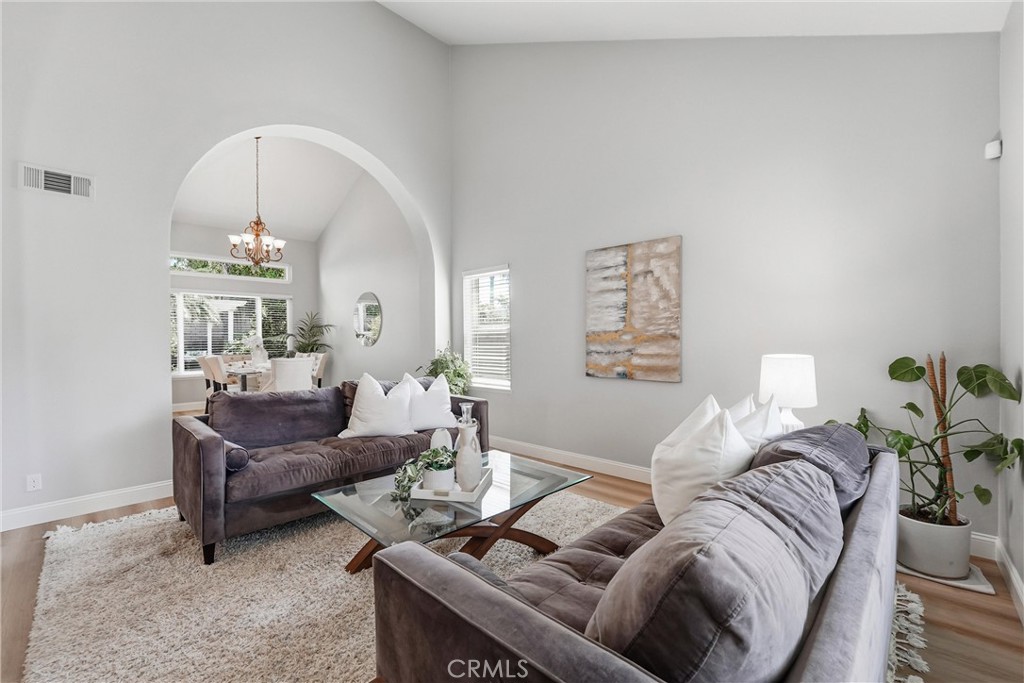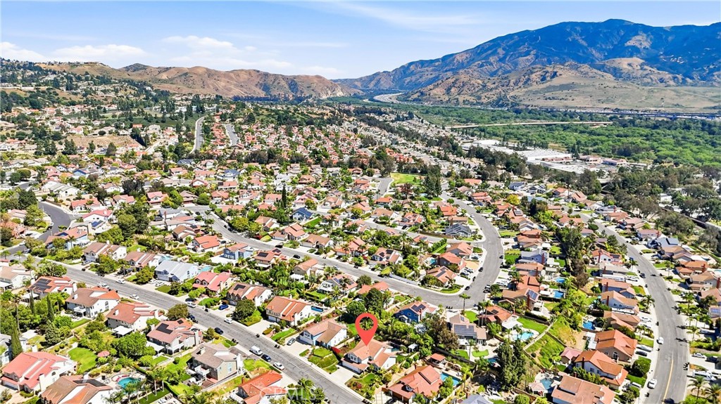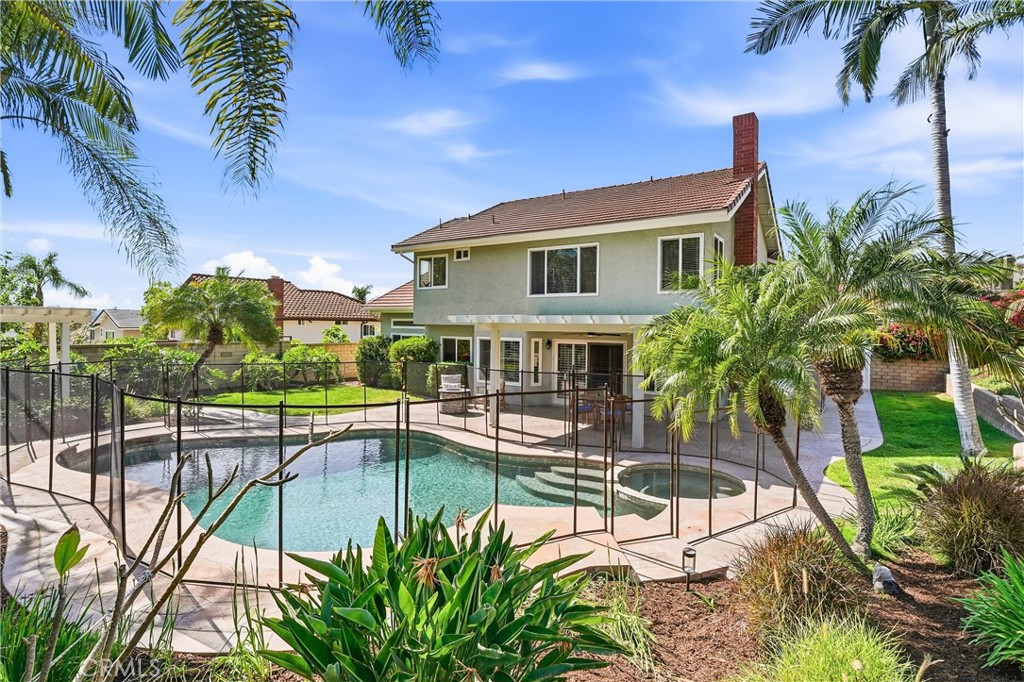 This stunning home blends elegance and comfort, featuring impressive curb appeal, a beautifully upgraded interior, and a resort-style backyard with pool and spa. A private entry foyer welcomes you with soaring cathedral ceilings, architectural arches, and an abundance of windows that fill the home with natural light, highlighting the gorgeous plank flooring throughout. Nearly every room offers scenic views of mature palm trees and lush landscaping. The spacious floor plan includes 5 bedrooms, including a highly desirable main-floor bedroom with a walk-in closet and custom built-ins. The main-level bathroom features a walk-in shower with custom stone finishes. The fully remodeled kitchen is a chef’s dream, showcasing quartz countertops, shaker cabinetry, a large center island with custom storage, dual ovens, coffee bar, and an expansive walk-in pantry, overlooking the beautifully landscaped backyard. Cathedral ceilings enhance the formal living and dining rooms, both offering picturesque views of the front and rear grounds. The family room opens seamlessly to the kitchen, creating an ideal space for gathering and entertaining. Upstairs, the grand primary suite features vaulted ceilings, large windows, and tranquil backyard views. The en-suite bath includes stone accents, a soaking tub, dual vanities, and a spacious walk-in closet. The secondary upstairs bedrooms are generously sized, including one oversized room with vaulted ceilings, a window nook, and walk-in closet—perfect for flexible use. The backyard is an entertainer’s dream, offering multiple areas for dining, lounging poolside, or relaxing beneath a pergola in a private, serene setting. Rarely does a pool home offer this much space for entertainment, storage, and recreation. Additional highlights include newer dual-pane windows, saltwater pool with remote system, remodeled bathrooms, updated kitchen, new plank flooring, dual ovens, walk-in pantry, indoor laundry room, and fresh interior and exterior paint. Located within the Yorba Linda High School boundary and conveniently close to the 91, 241, 55, and 57 freeways.