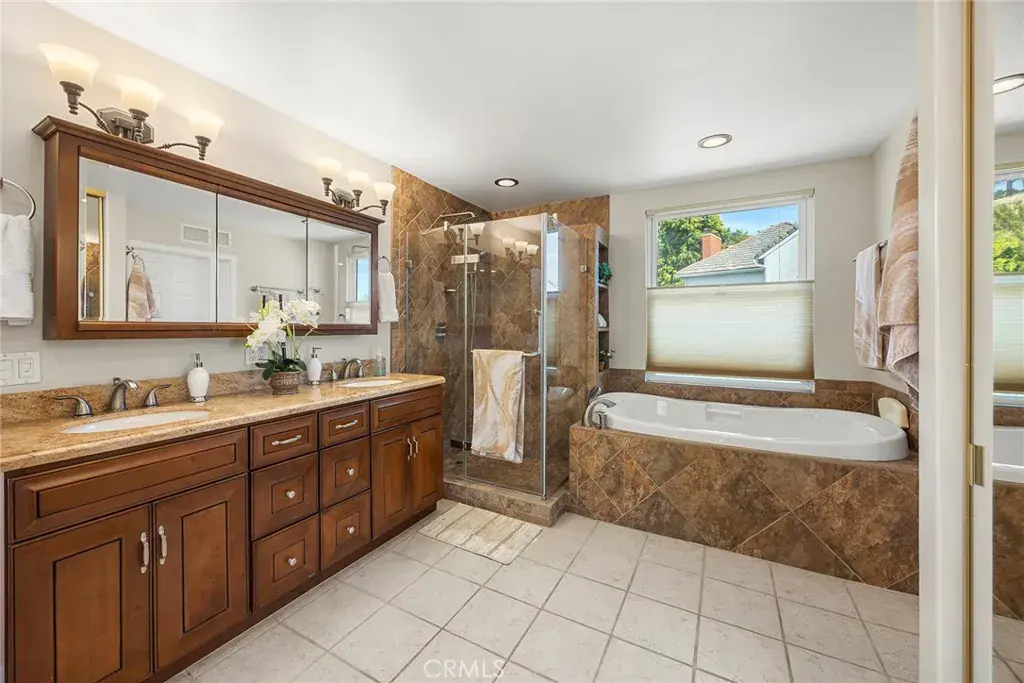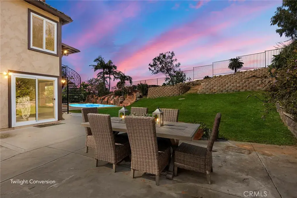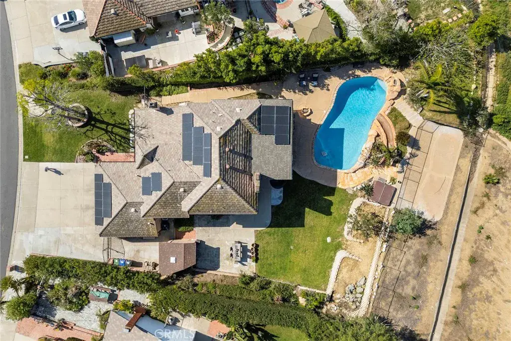 Perched on a spacious 13,500 sq ft lot in a tranquil, elevated setting, this remarkable estate commands 180-degree panoramic views spanning glittering city lights, Disneyland fireworks and rolling hills beyond. A rare offering of versatility, the residence features 7 bedrooms and 5 bathrooms, and an office, thoughtfully designed for both luxurious living and multi-generational flexibility. A grand arrival begins through 8-foot custom double steel doors, opening to a light-filled interior defined by soaring wood-beamed vaulted ceilings. The home’s design balances warmth and sophistication, with curated spaces ideal for both intimate living and grand entertaining. The main level showcases a newly remodeled chef’s kitchen, appointed with premium granite countertops, custom real-wood cabinetry, double ovens, a four-door refrigerator, garden window, and sleek black stainless-steel appliances. Flowing seamlessly into the living room, the space is enhanced by an upgraded fireplace and framed by expansive windows and California sliding glass doors that open to the outdoor entertaining terrace. A junior ADU offers exceptional flexibility, complete with its own bedroom, walk-in closet, designer bathroom, full kitchen, and living area—perfect for extended family, guests, or additional income potential. Resort-style outdoor living awaits, featuring a custom pool with dramatic rock waterfall, 16-foot slide, and multicolor lighting, a gas fire pit, covered patio, built-in BBQ station with bar seating, and a 7-person Cal Spa with over 50 jets—an entertainer’s dream set against a breathtaking backdrop. The primary suite is a serene sanctuary, offering vaulted ceilings, a private fireplace, sitting area, and spa-inspired bath with a two-person soaking tub, custom shower, and dual sinks with granite counters. California sliding doors open to a covered private balcony with spiral staircase access to the pool level. A second primary bedroom with en-suite jetted spa bath provides additional luxury accommodation. Additional highlights include three designer fireplaces, 14 ceiling fans, fully upgraded bathrooms throughout, 33 owned solar panels with micro-inverters, SolarEdge monitoring, EV charging station, custom two-level work shed, RV/boat parking, and no rear neighbors for enhanced privacy. Located within the coveted Chateau Hills community, this exceptional residence offers a rare combination of luxury, privacy, and iconic Southern California views.