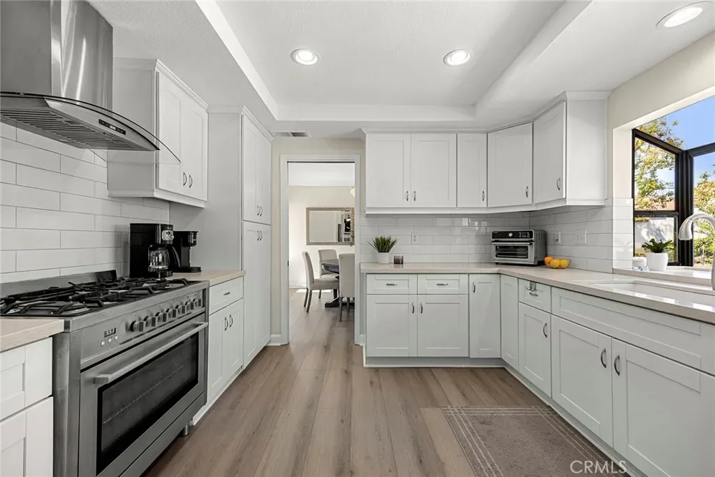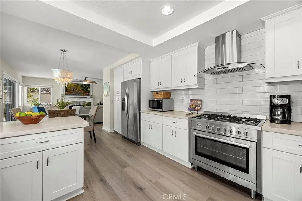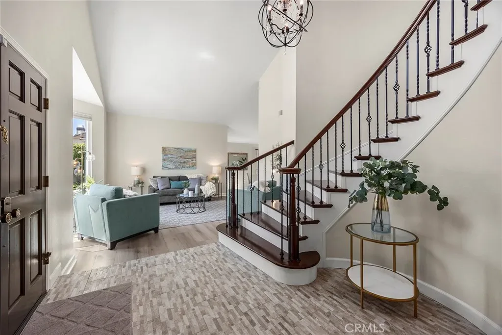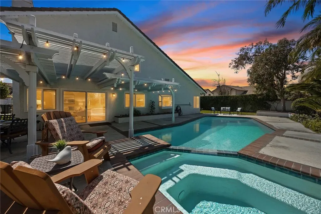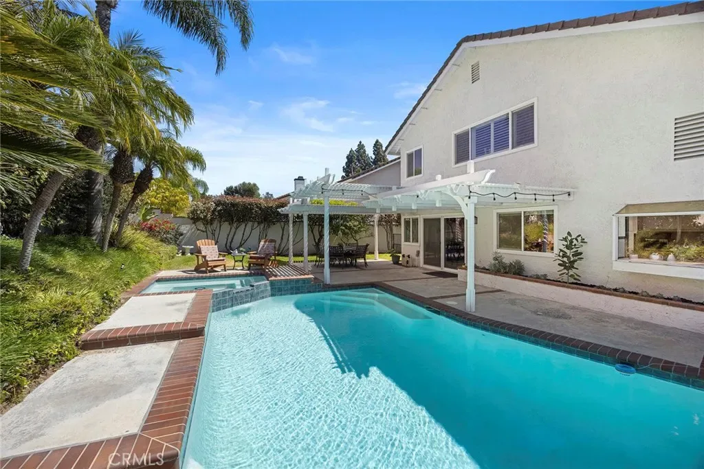 Situated on a desirable corner lot within the prestigious East Lake Village community of Yorba Linda, this beautifully remodeled pool home offers the perfect blend of comfort, style, and functionality. Featuring four bedrooms—including a spacious primary suite—and a convenient downstairs bedroom with full bath, the layout is ideal for both everyday living and hosting guests. Step inside to an inviting, light-filled interior that feels like a brand-new home. The expansive living room showcases a large front window, creating a bright and welcoming atmosphere. The remodeled kitchen is a true centerpiece, overlooking the backyard oasis and outfitted with a 5-burner Cosmo range and Bosch dishwasher—perfect for any culinary enthusiast. Adjacent to the kitchen, a generous breakfast nook and formal dining room provide versatile dining options, while the open-concept family room with a cozy fireplace enhances the home’s warmth and flow. Throughout the home, thoughtful upgrades include luxury vinyl flooring downstairs, a mix of vinyl and plush carpet upstairs, and updated tile in all bathrooms, each tastefully remodeled. An interior laundry room adds everyday convenience. Outdoors, the expansive backyard is designed for both relaxation and entertainment. Enjoy a recently re-plastered pool and spa with new coping, ample patio space, and a large grassy area—all set on an approximately 9,000 square foot lot. A three-car garage completes the property. Residents of East Lake Village enjoy access to resort-style amenities including a clubhouse, gym, sports courts, and a scenic lake perfect for a walk around or a leisurely Duffy boat ride—all with a low HOA that enhances the exceptional lifestyle this community provides.
