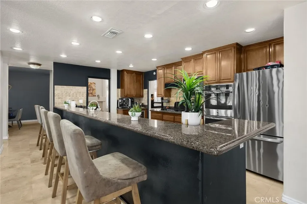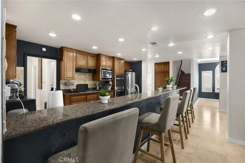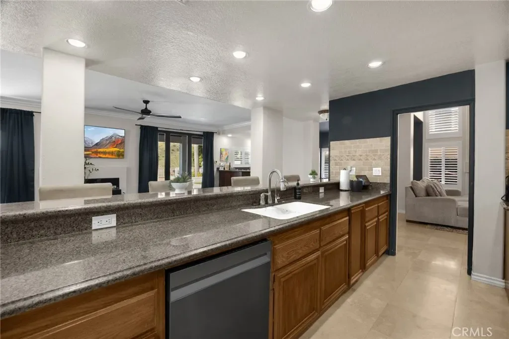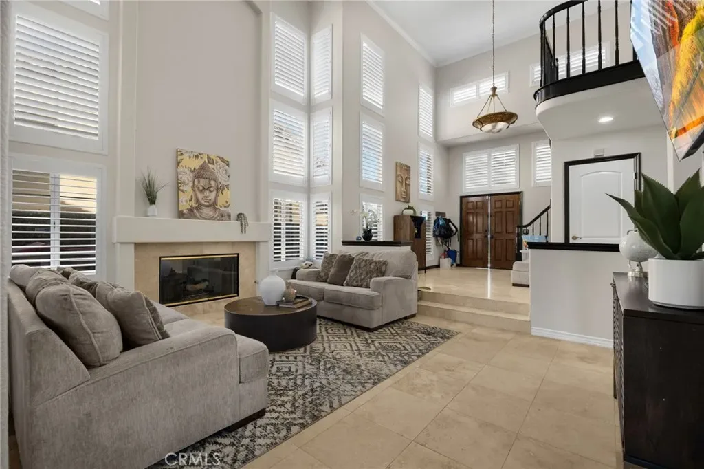 A dramatic entry with soaring 20-foot ceilings opens to the formal living room highlighted by a beautiful fireplace. The thoughtfully designed floorplan offers seamless flow between the living room, dining area, and spacious family room. The entertainer’s kitchen is the heart of the home, showcasing abundant cabinetry, a large island with breakfast bar seating, gas cooktop, stainless steel appliances, double ovens, and a wine refrigerator, all overlooking the inviting family room with breathtaking city lights and sunset views.
