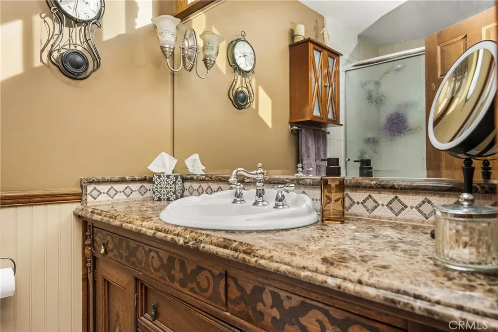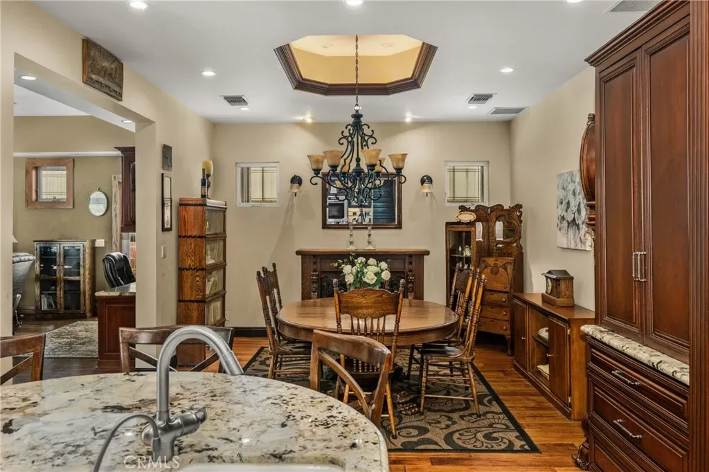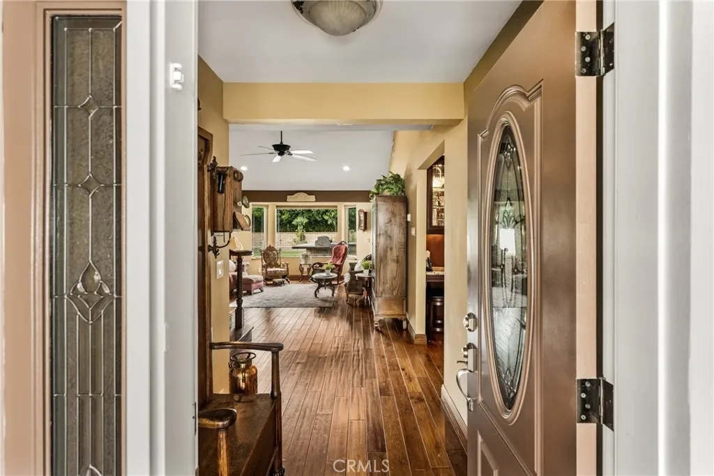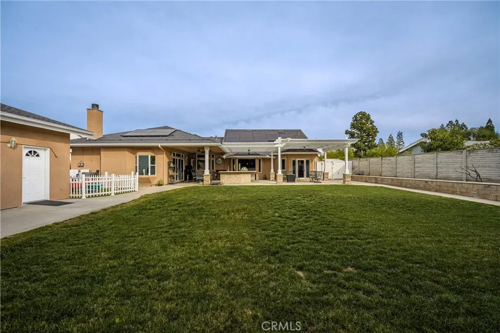 This 5 bed, 3 bath home with a 2 bed 1 bath ADU and RV parking on an oversized lot with solar panels is perfect for multigenerational living and is in one of Yorba Linda’s most desirable neighborhoods! Main lives like a single level with the primary suite, two bedrooms/one bath on the first floor and two beds/one bath upstairs. The detached ADU offers potential for income, and the RV driveway has electricity and dump station. For those warm Summer nights, the extended roof patio spans the front of the home and your lawn will always look mowed with the manicured artificial turf. The RV gate is 17 ft wide and the driveway is over 60ft long and 18ft wide from eves to wall along side the 3 car garage. Inside, views to the backyard, vaulted ceilings, and a warm wood floor greet you. The classic kitchen is beautifully appointed with top-of-the-line appliances including a Sub Zero refrigerator, Dacor 5 burner stove, Miele double ovens and warming drawer, Kitchenaide stainless dishwasher and fridge with panel doors matching the cherry cabinets with beading. A Farmhouse sink and solid maple pullout drawers including a spice rack, and two lazy Susans with many soft close drawers make this kitchen as functional as it is beautiful. The spacious island showcases Splendor granite, a separate sink and seating for three. The ample cabinetry also offers a coffee cabinet and Splendor backsplash diamond cut outs. An abundance of lighting tops it off. The large dining area can accommodate a 12 ft table and has fireplace. Everyone will come hang out in the huge room with the stone covered fireplace and hearth. The windows and the sliding glass door to the outdoor kitchen bring lots of light. Built in cabinets and desk span one whole wall. Step out to the patio where you’ll find an outdoor kitchen that was recently constructed with concrete counters, a Blaze BBQ, 2 burner stove, sink and garbage disposal. Green grass, avocado trees, and the ADU are surrounded by concrete and slump stone walls. The 920 foot ADU hosts 2 bedrooms and 1 bath with kitchen overlooking a very spacious gathering area, and outside is a gated artificial turf yard. Step back into the primary room doors in the main house to find a spacious room with a wall of closets, walk in shower in the primary bath and down the hall 2 bedrooms with wood floors and the hall bath with tub. Up stairs you’ll find 2 more bedrooms and a hall bath with a shower. Shopping, theatre, Yorba Linda lakebed and great schools.