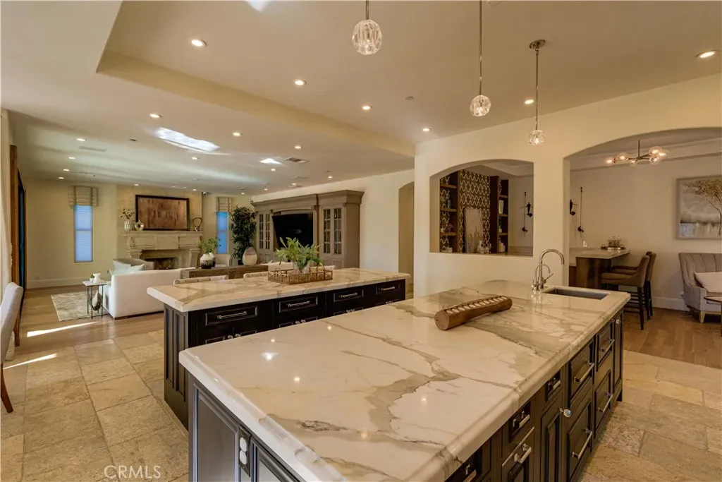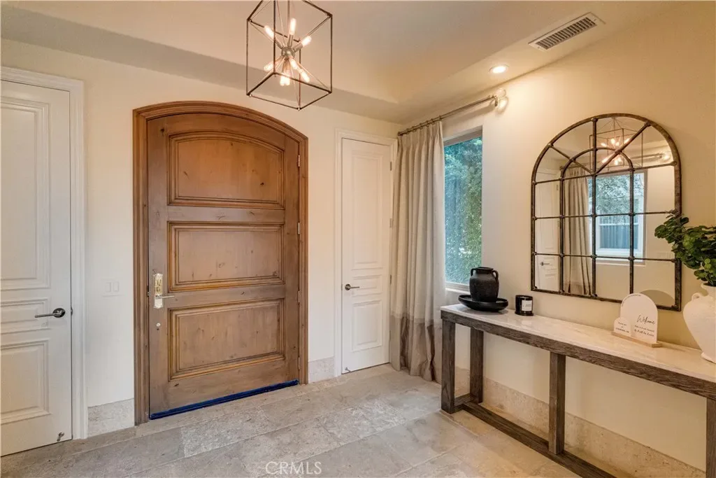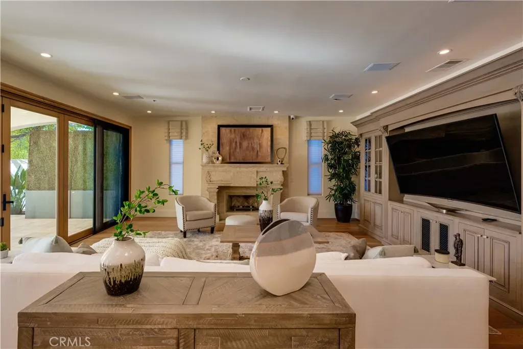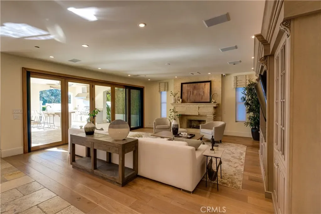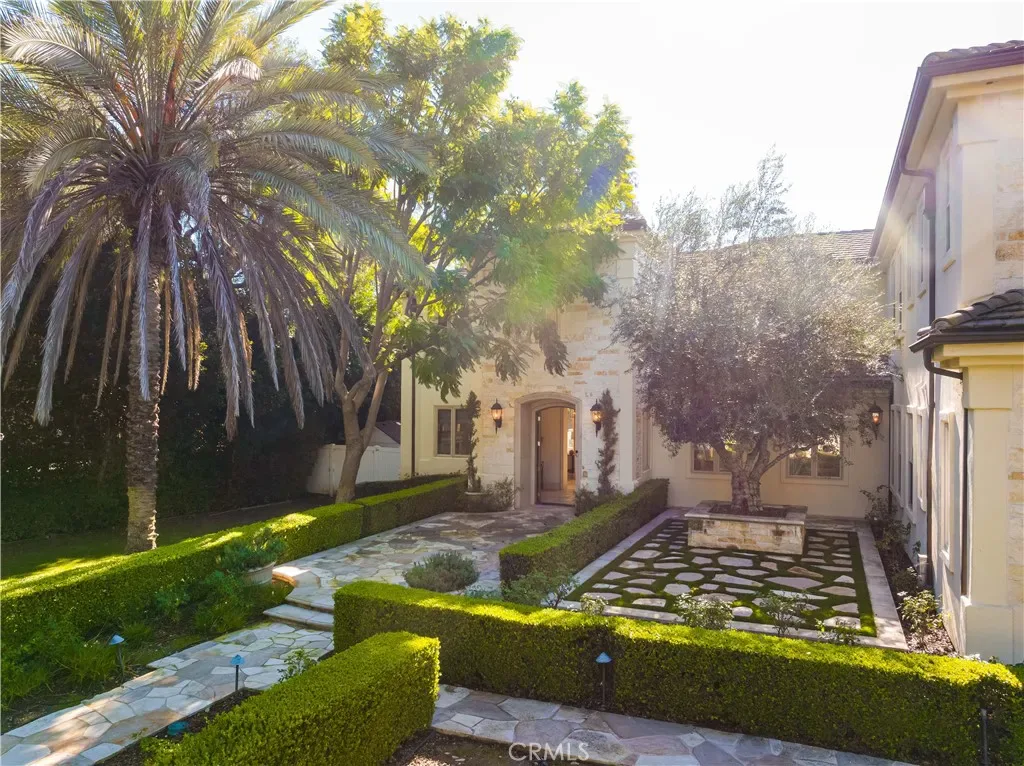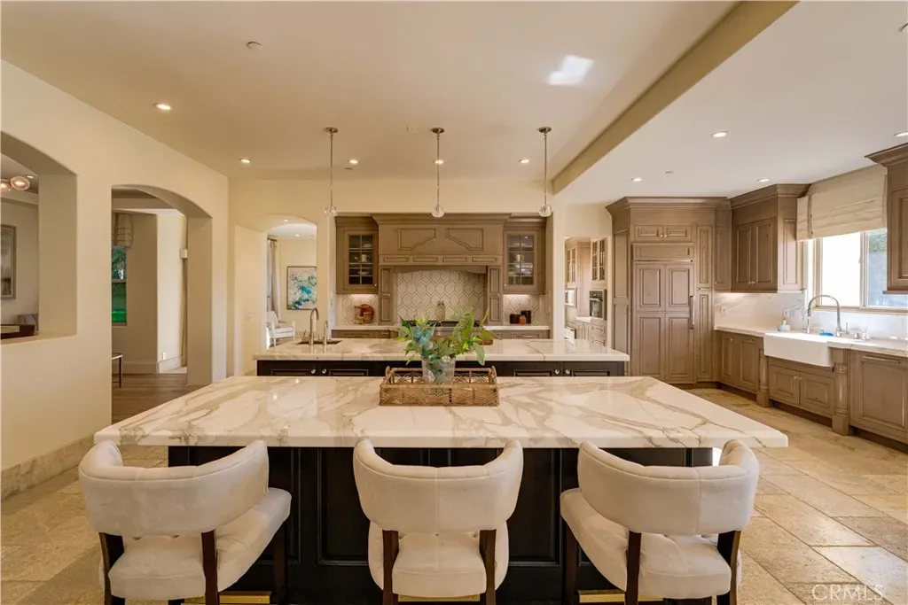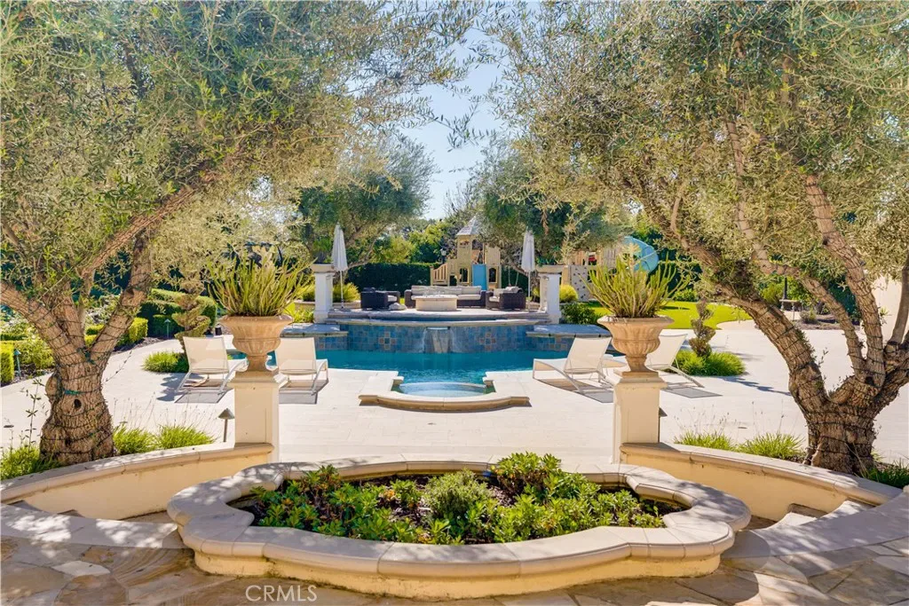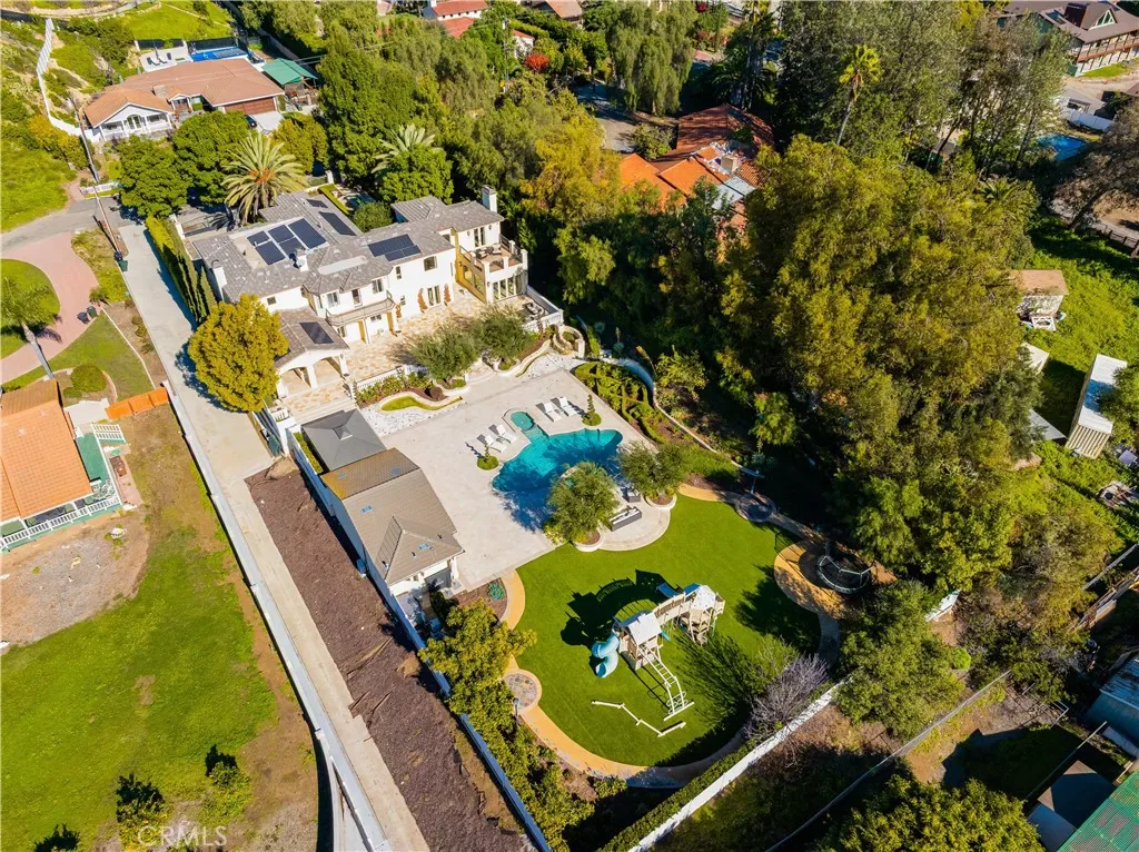 The thoughtfully designed backyard is ideal for both entertaining and everyday enjoyment, featuring a resort-style pool, landscaped outdoor spaces, a children’s playground, and a separate guest house/ADU offering flexible living options. Inside, the home showcases timeless architecture with a spacious and functional floor plan. Natural travertine stone flooring flows throughout, complemented by elegant natural stone countertops and refined finishes. Each living space is generously proportioned, blending comfort with understated luxury.