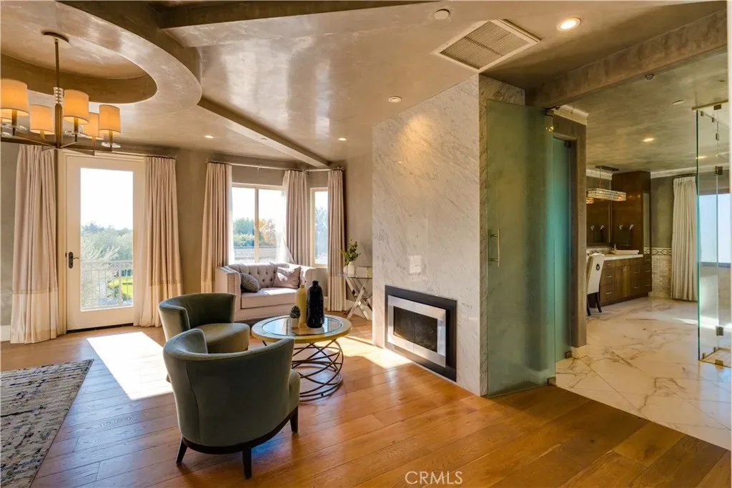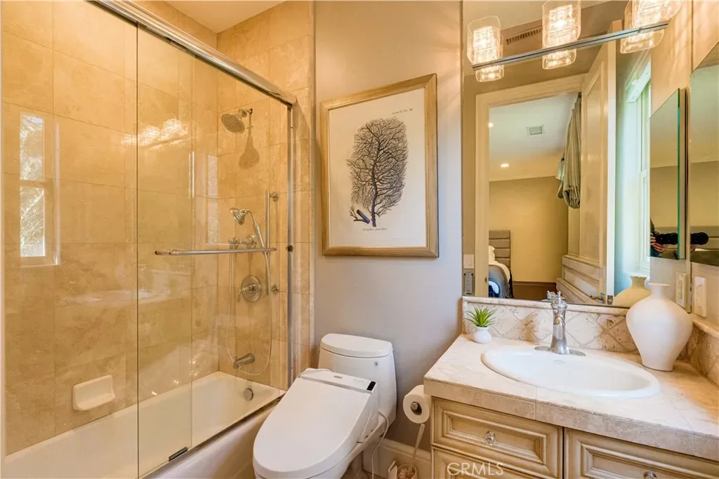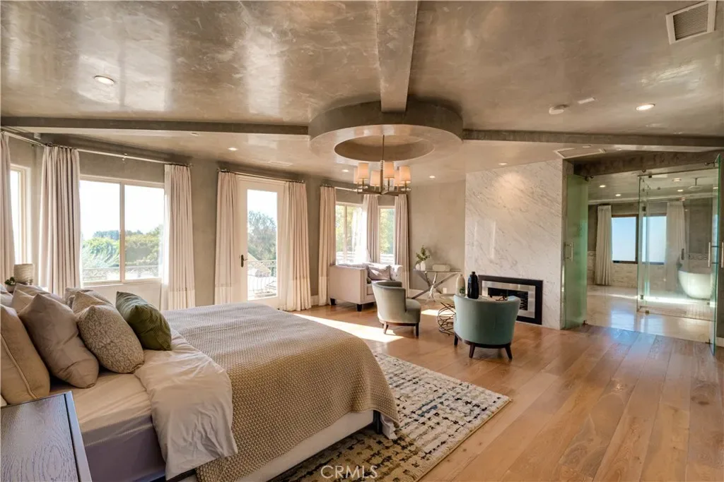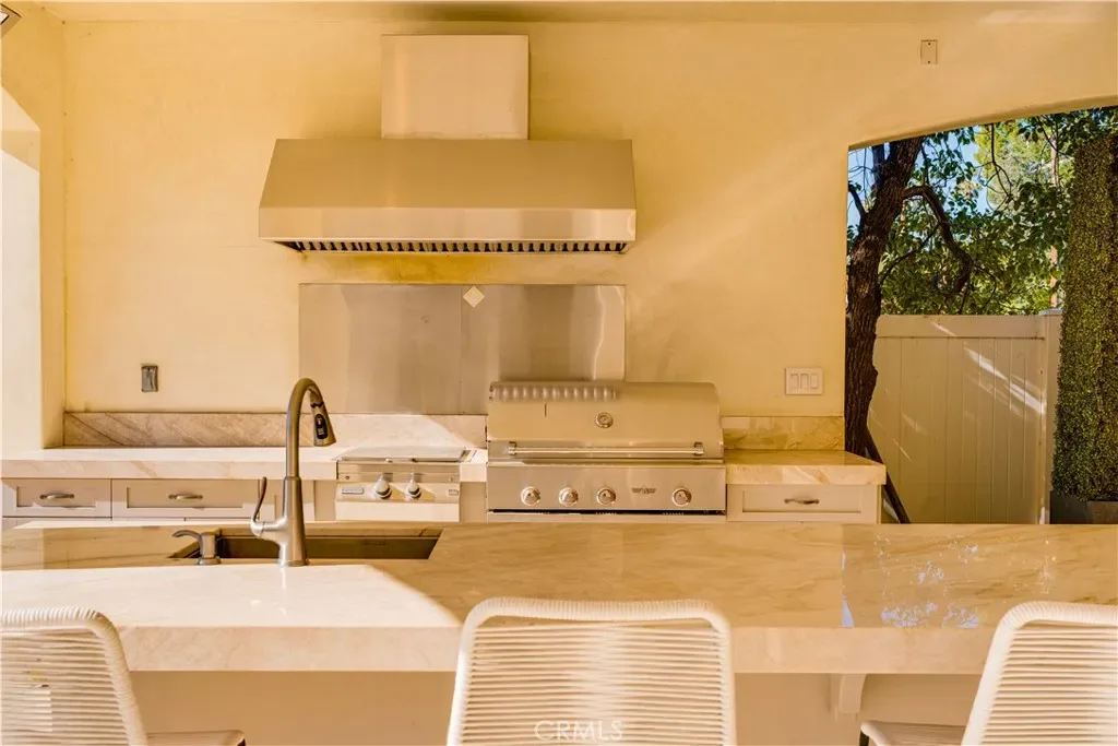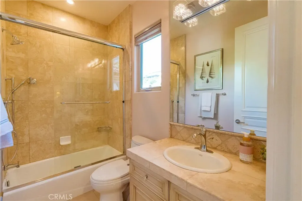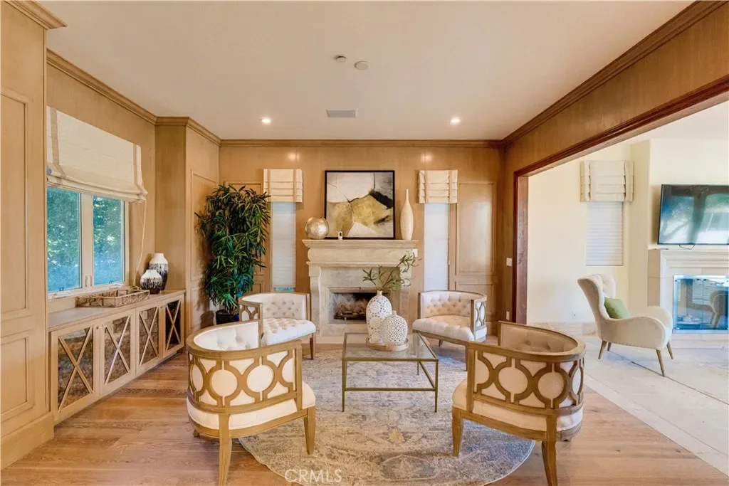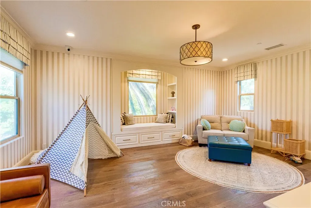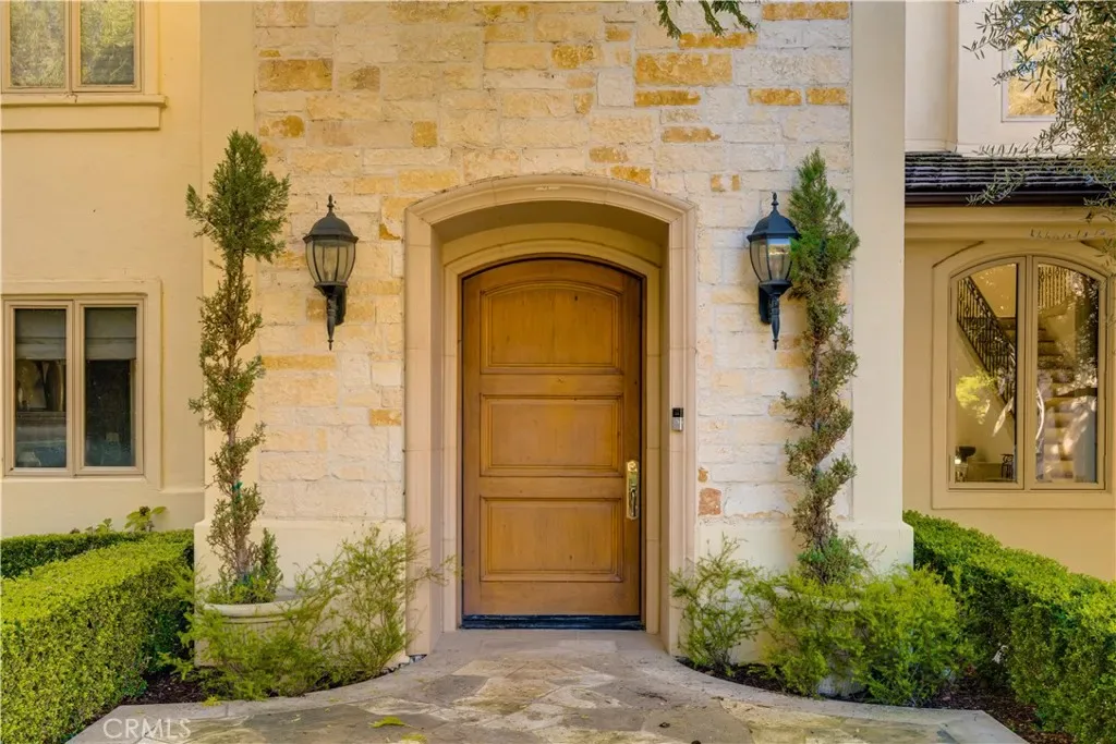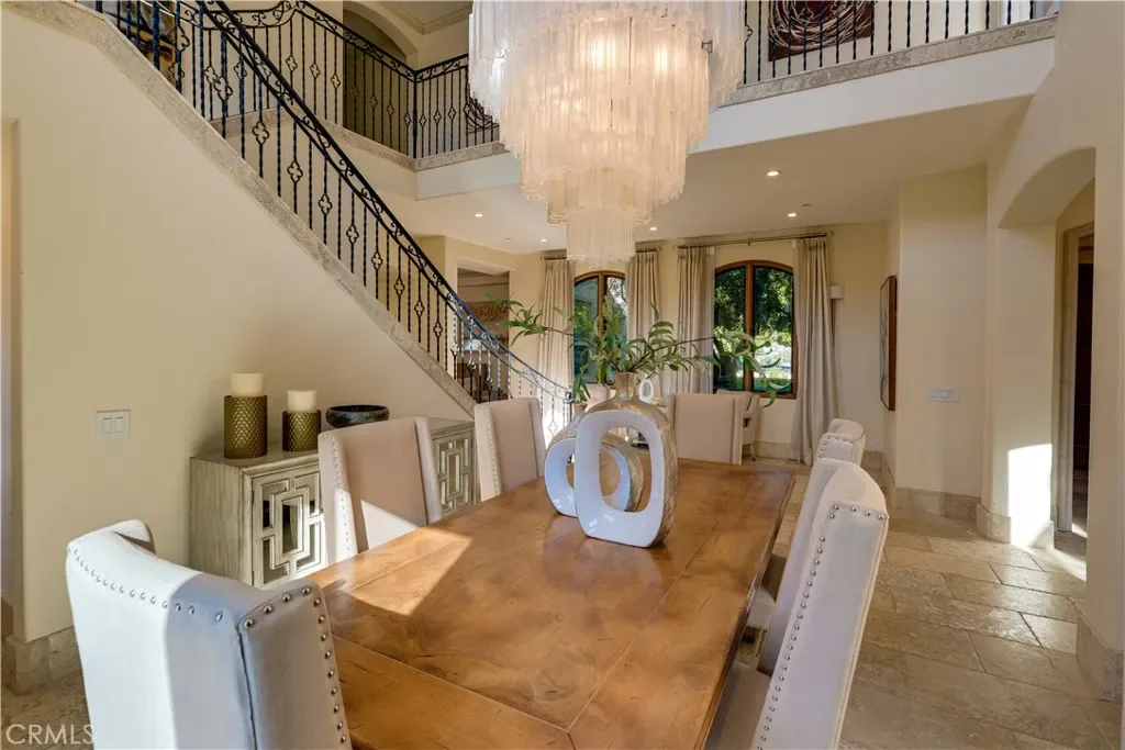 The thoughtfully designed backyard is ideal for both entertaining and everyday enjoyment, featuring a resort-style pool, landscaped outdoor spaces, a children’s playground, and a separate guest house/ADU offering flexible living options. Inside, the home showcases timeless architecture with a spacious and functional floor plan. Natural travertine stone flooring flows throughout, complemented by elegant natural stone countertops and refined finishes. Each living space is generously proportioned, blending comfort with understated luxury.