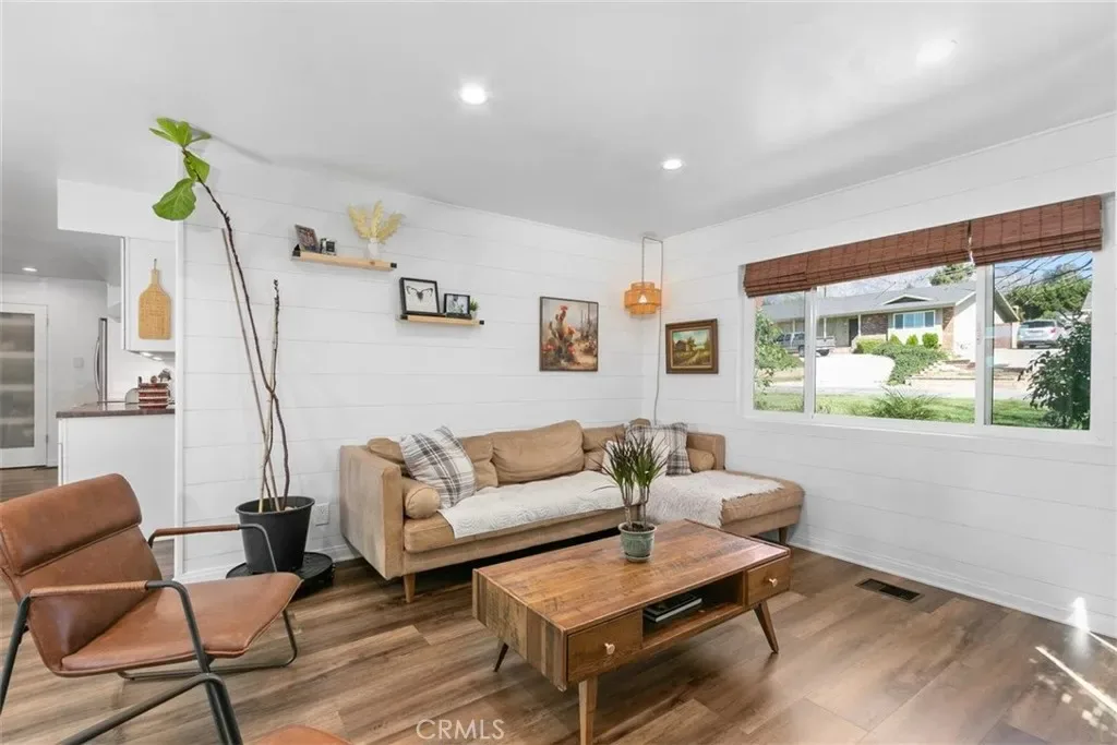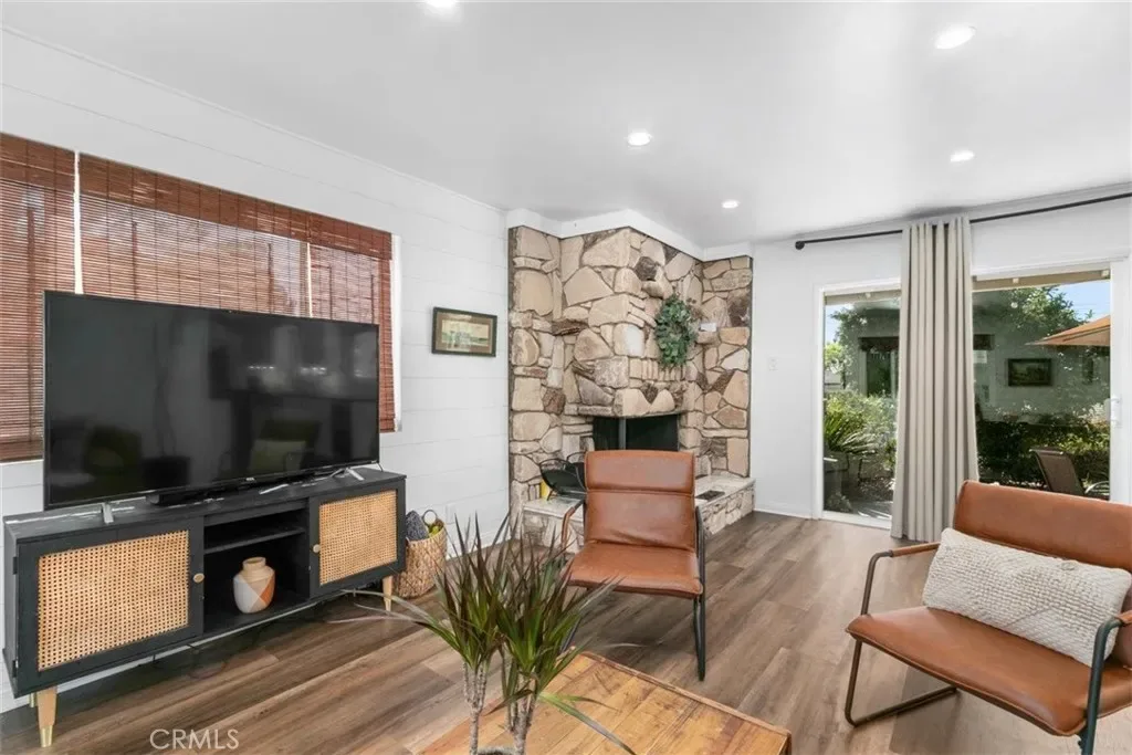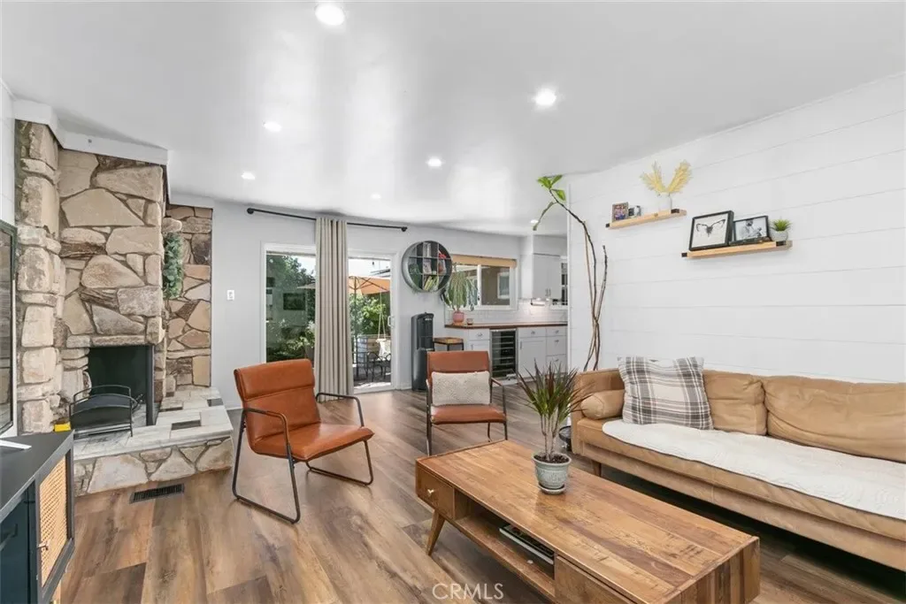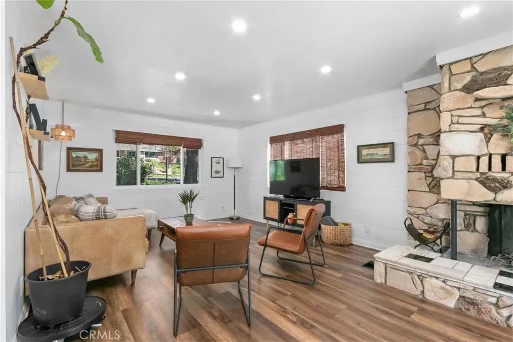The living room is anchored by a striking stone fireplace, creating a cozy yet elevated space to unwind and connect. Thoughtful updates throughout the home give it a clean, modern feel while maintaining its character and charm.
