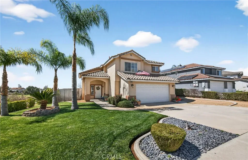 PRICE IMPROVEMENT! Welcome to this BEAUTIFULLY UPDATED HOME ideally situated on a corner lot and on a CUL-DE-SAC with NO HOA. With high ceilings and abundant natural light, the home offers a bright and inviting atmosphere from the moment you step inside. The main level features both a living room with high ceilings and a family room, connected by a striking see-through fireplace that creates warmth and character throughout the space. The kitchen has quartz countertops and a refrigerator that stays with the property if needed. Downstairs a guest bathroom, indoor laundry room, and direct access to the two-car garage add everyday convenience. Upstairs, all bedrooms are thoughtfully located, including the spacious primary suite with a double-door entry tucked down the hall. The primary bath suite offers dual sinks, large mirrors, and generous counter and cabinet space. The upstairs guest bathroom between the two guest rooms has been beautifully updated with a new deep tub and classic white subway tile shower. The upstairs hallway provides a large linen closet and boasts an amazing view of the downstairs living room. Step outside to the backyard with a patio cover, and orange and peach fruit trees, providing a great setting for relaxing, entertaining, or enjoying the outdoors. The back yard has a gas hookup for a fire pit and the water heater is less than a year old. Positioned perfectly to take in Yucaipa’s beautiful sunsets, this home offers both comfort and desirability in this cul-de-sac neighborhood.