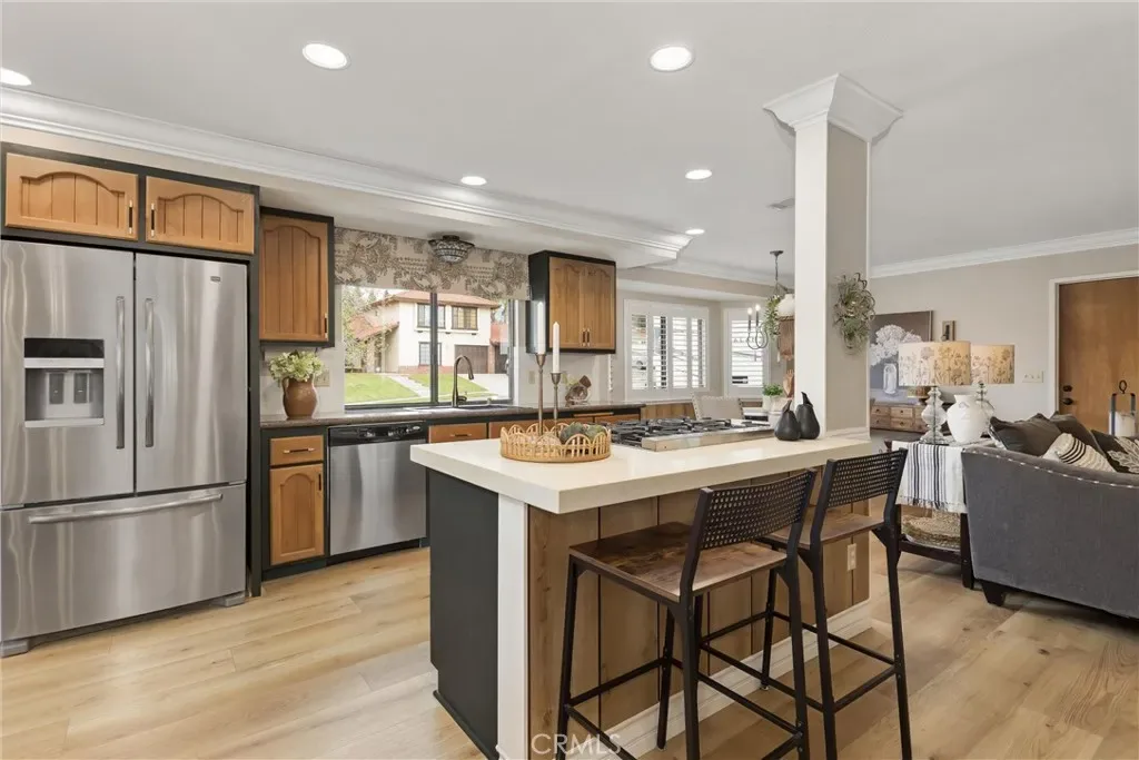 Perched gracefully on a serene corner lot, the home boasts an elevated position, welcoming you with beautifully bricked entry steps that lead through an inviting archway. Alternatively, you can conveniently enter at street level via the garage or a charming walkway. The home features a seamless, open-concept layout, with walls expertly moved to create a breathtaking Great Room. Architectural details include recessed lighting, classic crown moldings, and custom wainscoting, creating a timeless atmosphere. The spacious dining area is perfect for hosting holiday gatherings and flows effortlessly into a living space anchored by a warm, traditional brick fireplace. The chef’s kitchen is a true showpiece featuring a massive central island, custom cabinetry & stone countertops, and a designer-curated paint palette. The premium suite of appliances includes the stainless gas stove, microwave, refrigerator, and dishwasher, as well as the brand-new washer/dryer combination located in the hall near the beautifully remodeled full bathroom.