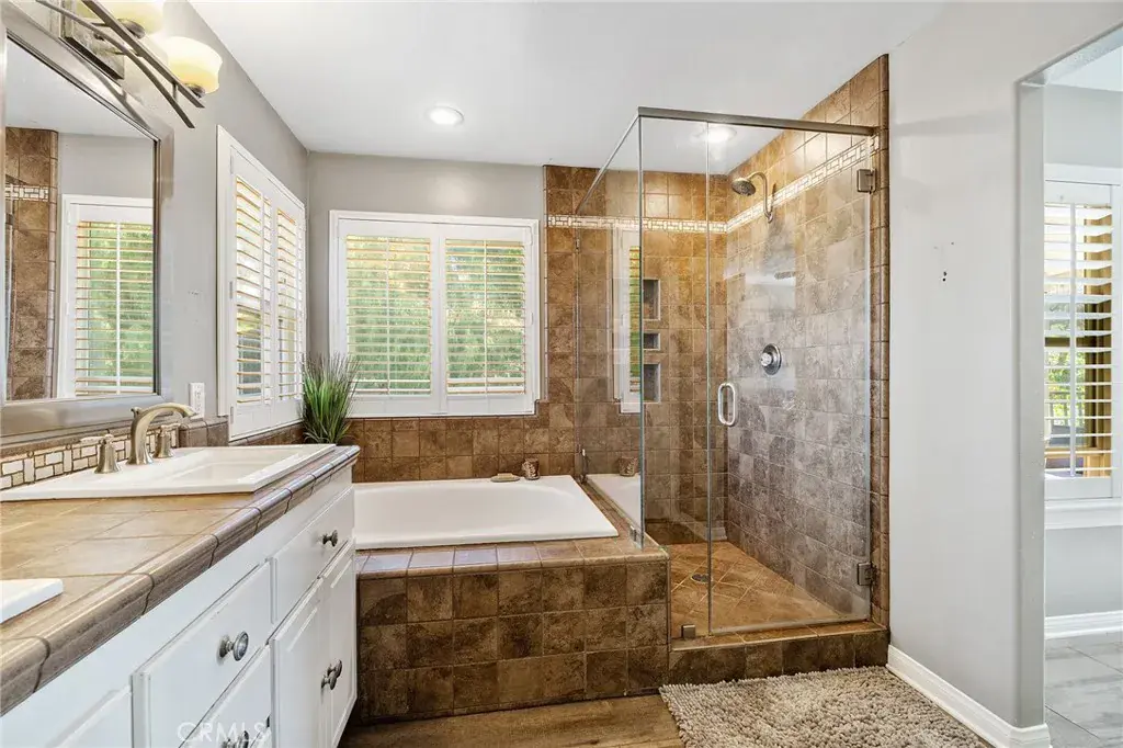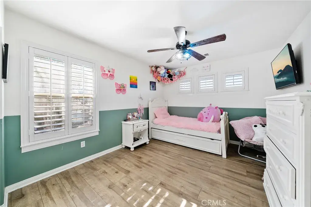 The heart of the home is a spacious, entertainer’s kitchen featuring gas appliances, Corian countertops, abundant cabinetry, and a seamless flow into the main living areas. All kitchen appliances are included, and plantation shutters throughout add timeless elegance while enhancing natural light.
