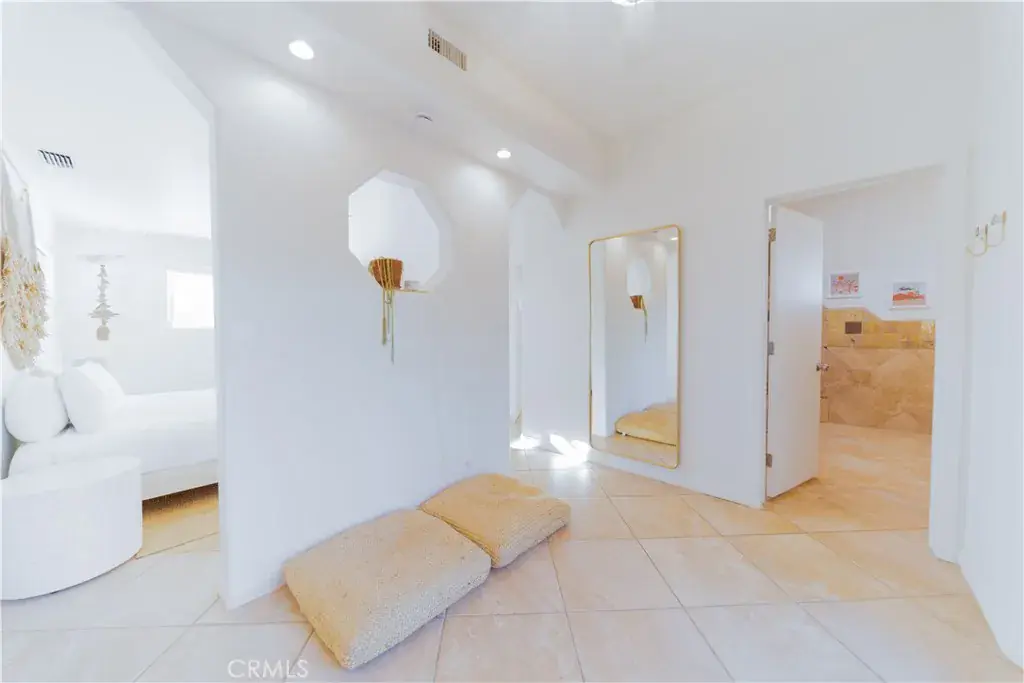 The home features three spacious bedrooms and two bathrooms and is offered fully furnished. Designed with multiple areas for meditation and relaxation, the home includes two fireplaces and a large two-car garage currently used as an art studio, complete with a half bath.