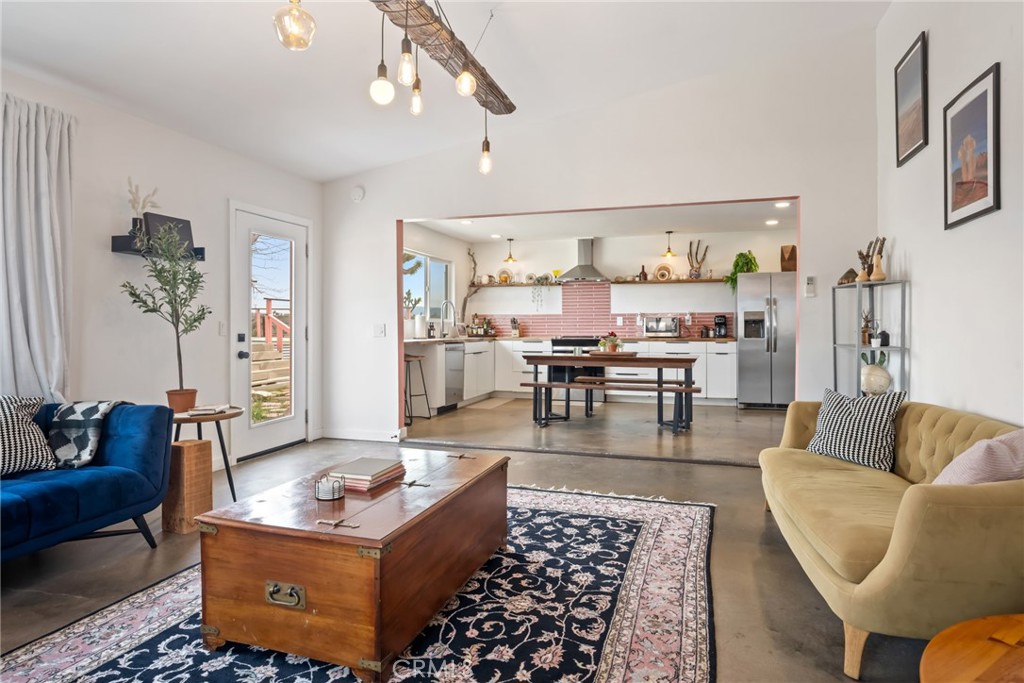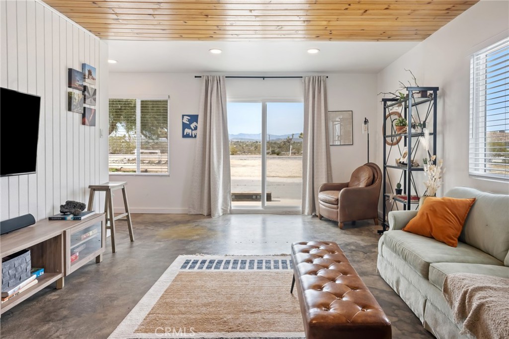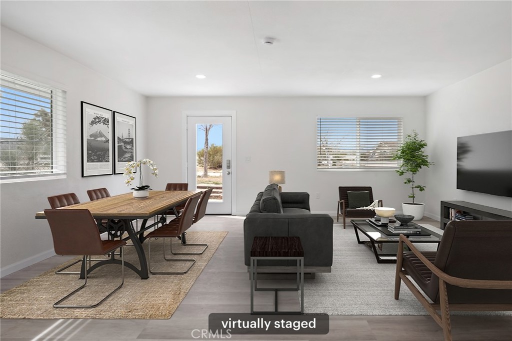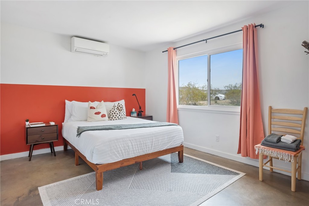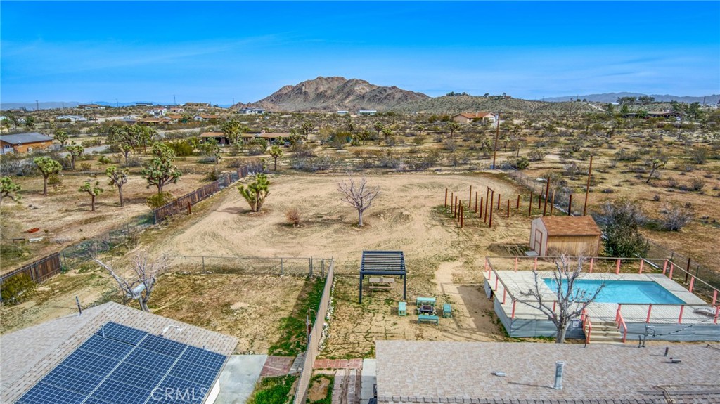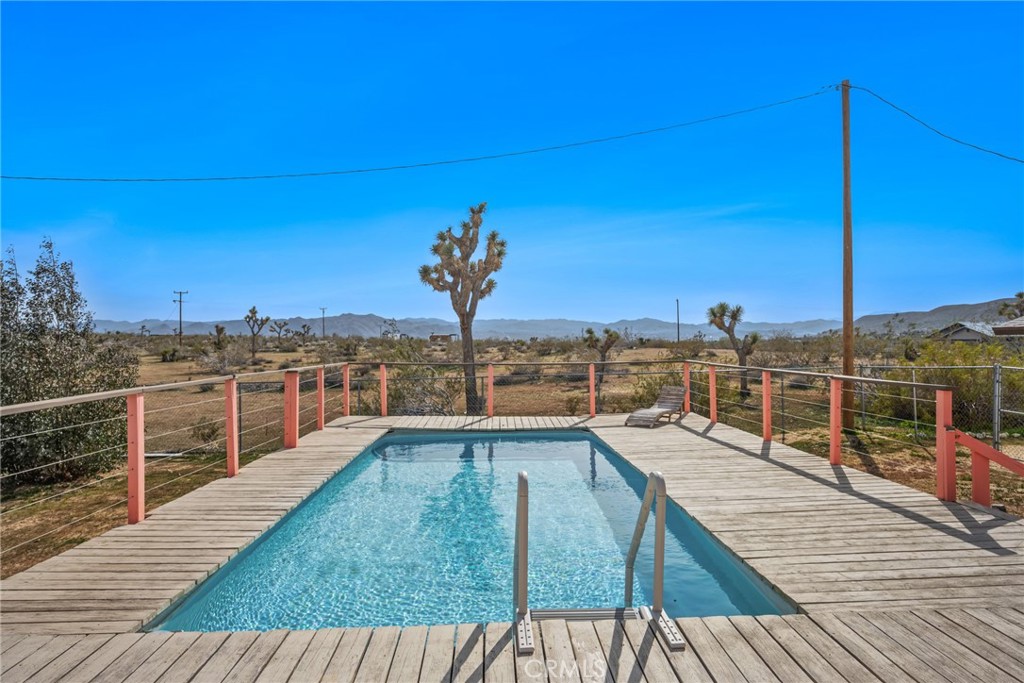 Rare opportunity to own two fully renovated homes on one expansive 1.08-acre lot, showcasing panoramic views of the Joshua Tree mountain range. This exceptional property is ideal for owner occupancy or investment, with a successfully proven short-term rental history as an Airbnb “Guest Favorite,” boasting a 4.9-star average rating and over 115 reviews. The main residence spans 2,005 sq ft and offers 4 bedrooms and 2 bathrooms, thoughtfully updated with modern finishes throughout. The newly remodeled bathrooms showcase beautiful tilework, stylish vanities, and contemporary hardware. The open-concept kitchen flows seamlessly into two distinct living areas, creating an ideal space for entertaining or relaxing. Highlights include quartz countertops, a pantry, updated recessed lighting, and newer electric appliances. The fully renovated ADU offers approximately 960 sq ft, featuring 2 bedrooms and 1 bathroom—perfect for extended family, guests, or rental income. Both units are equipped with efficient mini-split AC/heating systems for year-round comfort. Step out back to enjoy a 10-person above-ground pool, expansive deck, and spacious lot ideal for gatherings or other projects. Pull into the large circular driveway providing parking for up to 10 vehicles, with space for an RV or oversized vehicle. Additional features include solar panels for energy efficiency and a location that’s hard to beat—just 15 minutes to Joshua Tree National Park and 15 minutes to Pioneertown.