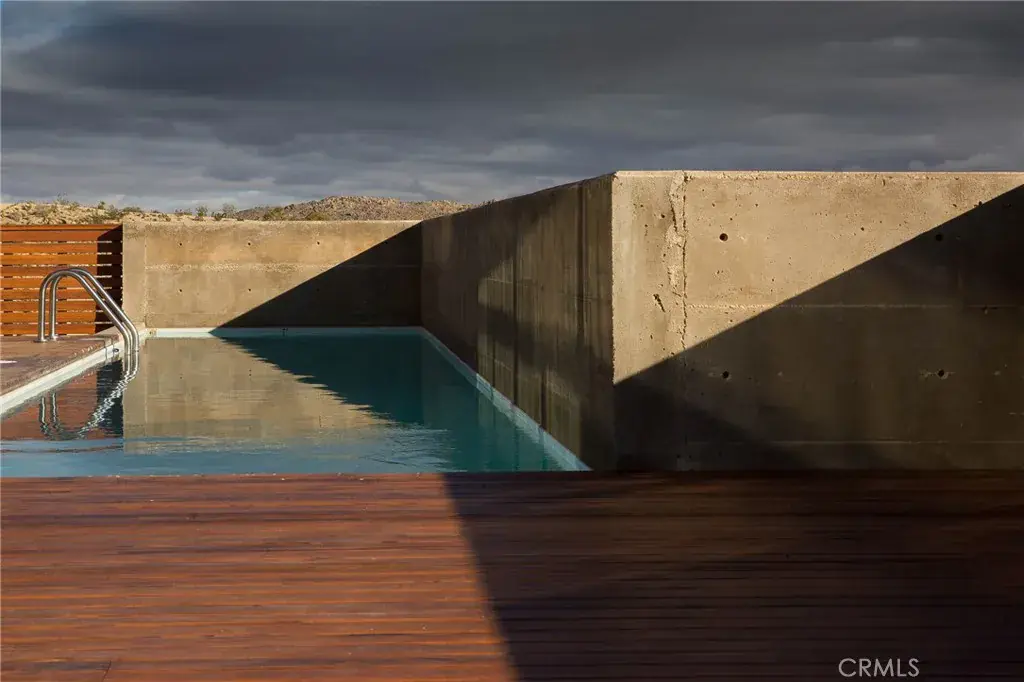 Blending modern design with clean architectural lines, the home features a thoughtfully designed entry foyer that sets an impressive tone upon arrival. The open-concept layout allows the interior spaces to flow effortlessly, combining comfort, style, and a sense of privacy. Every room captures stunning views—towering mountain ranges and Joshua Tree National Park by day, and the sparkling lights of downtown Joshua Tree by night. A private outdoor terrace with a heated pool and generous deck space offers the perfect setting for relaxation, entertaining, or enjoying the surrounding desert landscape.