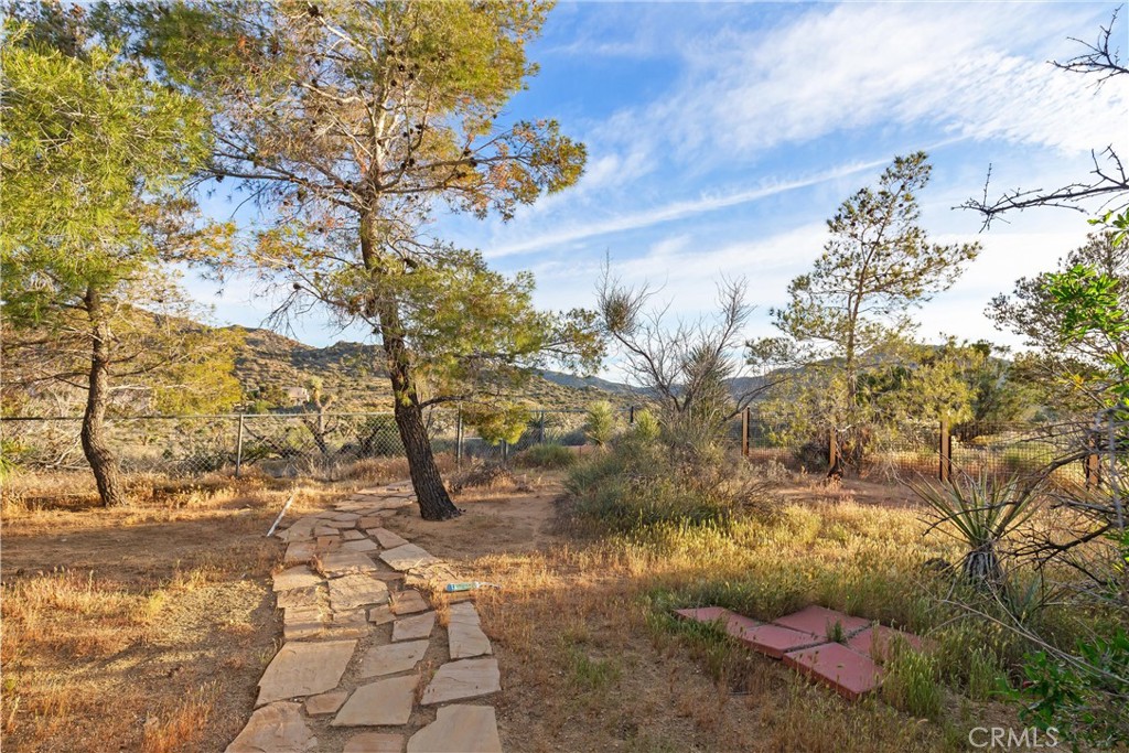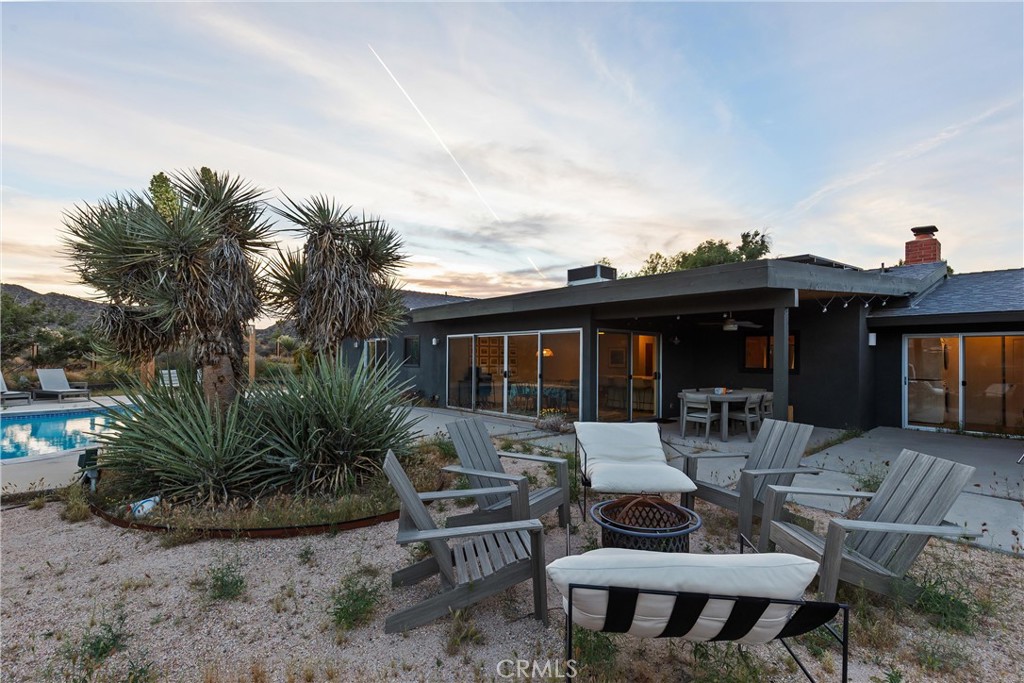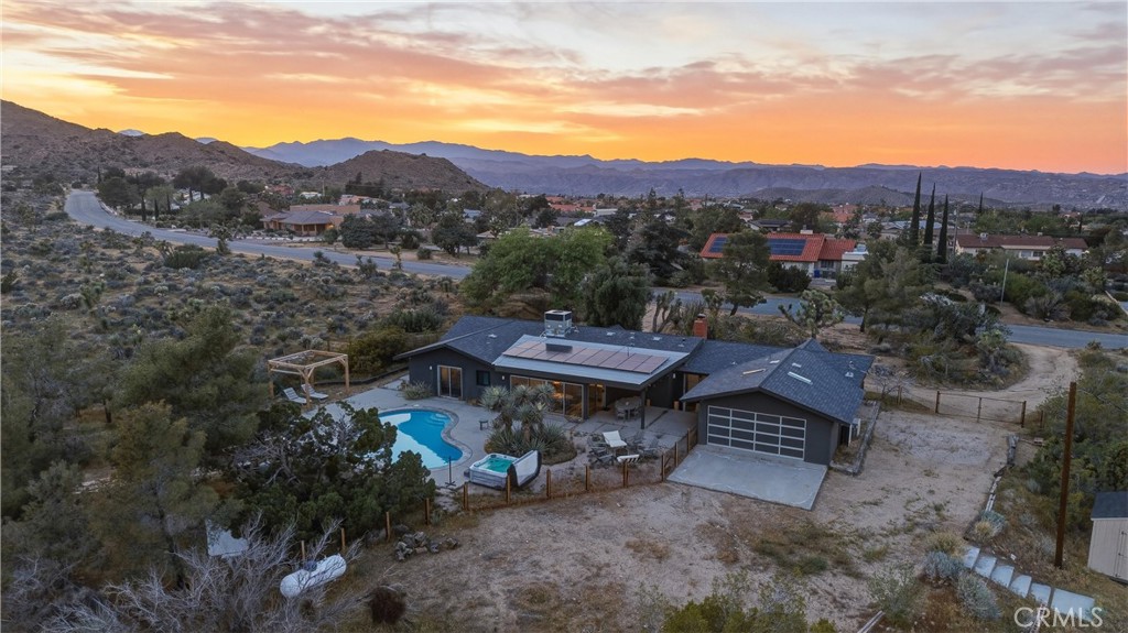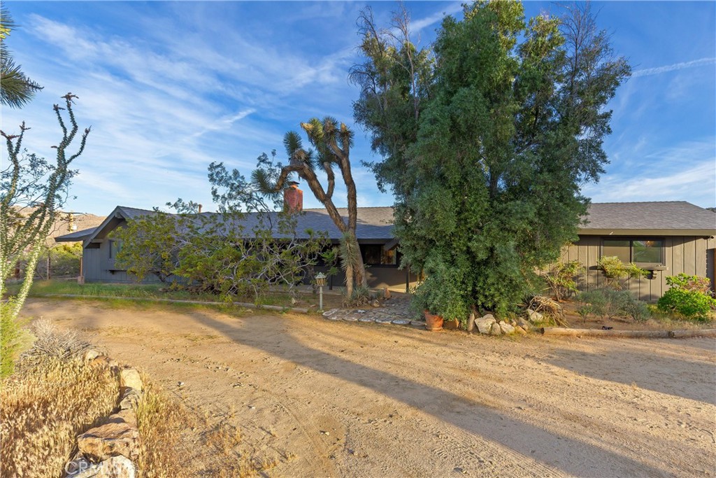 Set on 1.65 acres with unobstructed views toward Joshua Tree National Park, this thoughtfully updated ranch home offers privacy, comfort, and an easy connection to the surrounding desert. Clean, tasteful updates complement the home’s original character, including a handmade vintage rock fireplace that anchors the main living space. The spacious kitchen features rich hardwood cabinetry, generous storage, and room to cook, gather, and entertain. The layout includes three bedrooms, two and a half bathrooms, a separate office, an oversized bonus room currently used as a private screening room, and an attached finished studio that could also serve as a workshop or high-finish garage. An owned solar system adds long-term value, and every day efficiency. Outside, mature desert landscaping, sculptural cactus, and established trees create a beautifully grounded setting. The pool and spa sit beneath open skies, while the open land beyond and trail access just past the back gate give the property a rare sense of space and privacy. Set in a great location with easy access to town, the national park, and the best of the area, this is a home that works beautifully as a full-time residence, second home, or standout short-term rental.