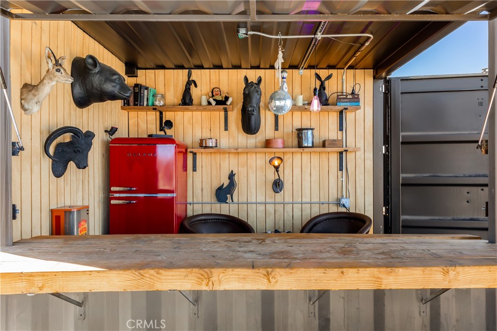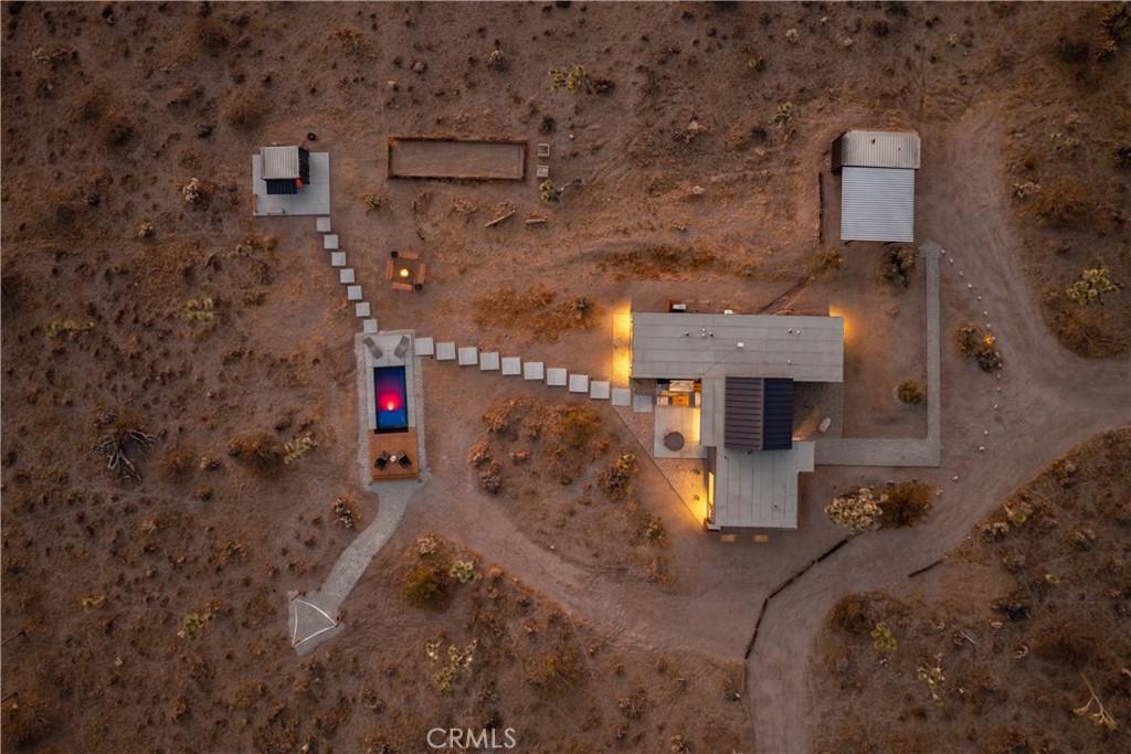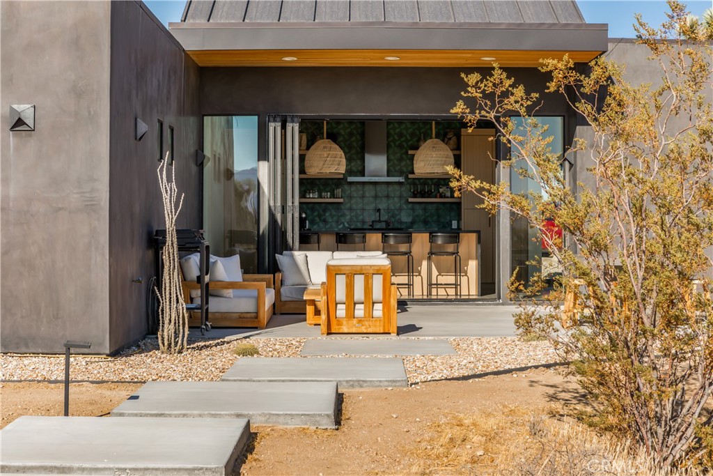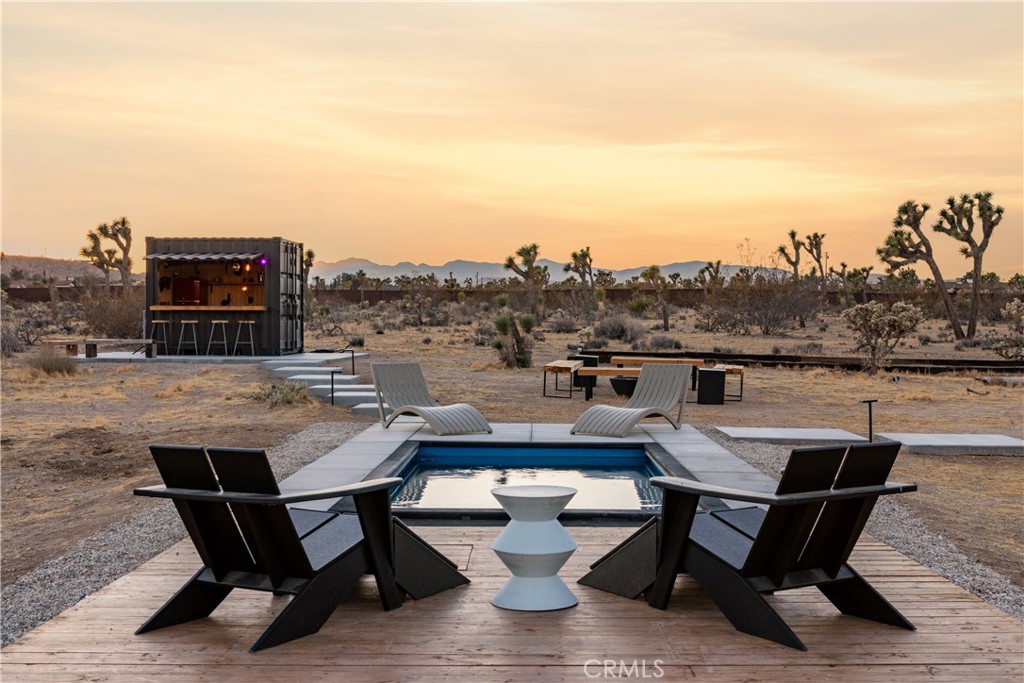 Outdoors, the property transforms into a true private oasis designed for relaxation and recreation. Enjoy a heated pool and spa, unwind at The Rabbit Hole—a stylish container-bar lounge with power and refrigeration—or gather under the stars around the fire pit. Additional amenities include a bocce court, multiple hammocks, and walking trails winding through the natural Joshua Tree landscape.