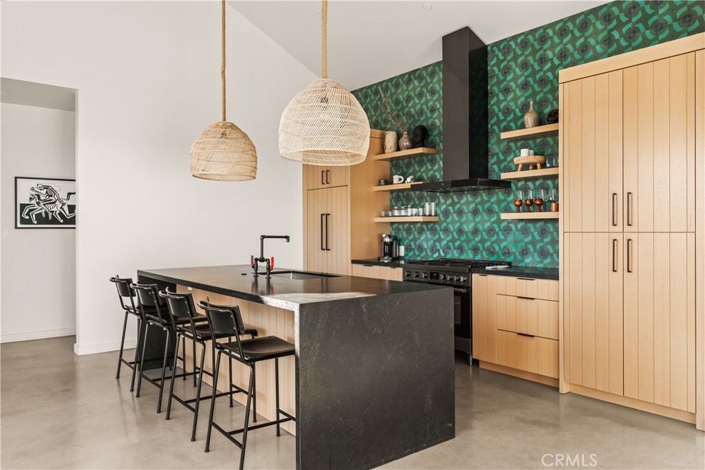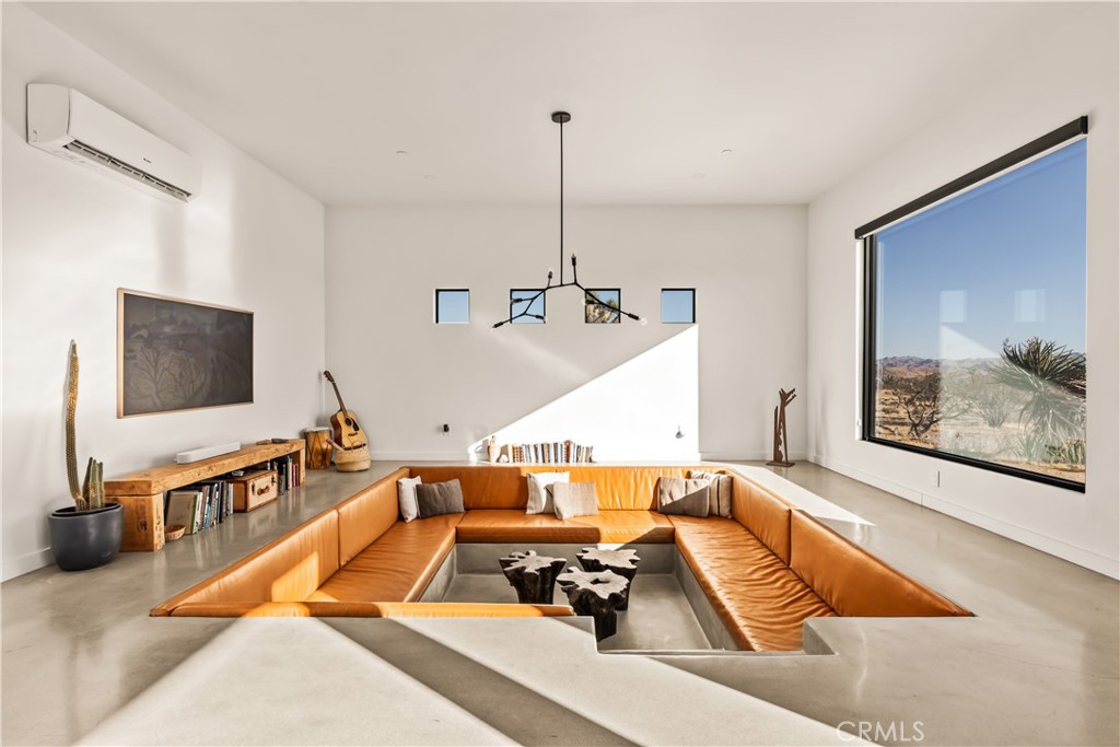 Inside, the home opens to an airy, light-filled interior anchored by a dramatic sunken conversation pit—an inviting focal point for both everyday living and entertaining. The open-concept living space flows into a chef’s kitchen featuring a 12-foot waterfall island, high-end finishes, and ample space for gathering. Oversized glass doors connect the interior to an outdoor dining patio with sweeping views of untouched desert terrain and distant ridgelines.