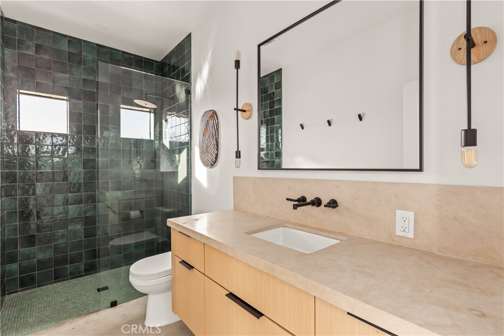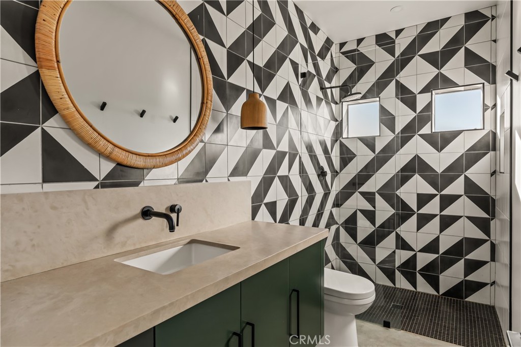 Eclectic interiors showcase thoughtfully paired with modern comforts. Three bedrooms are privately situated in the west wing, including a serene primary suite with an en-suite bathroom. Each bathroom features custom tilework and elevated finishes throughout.