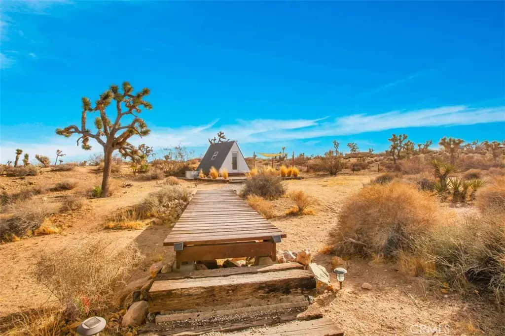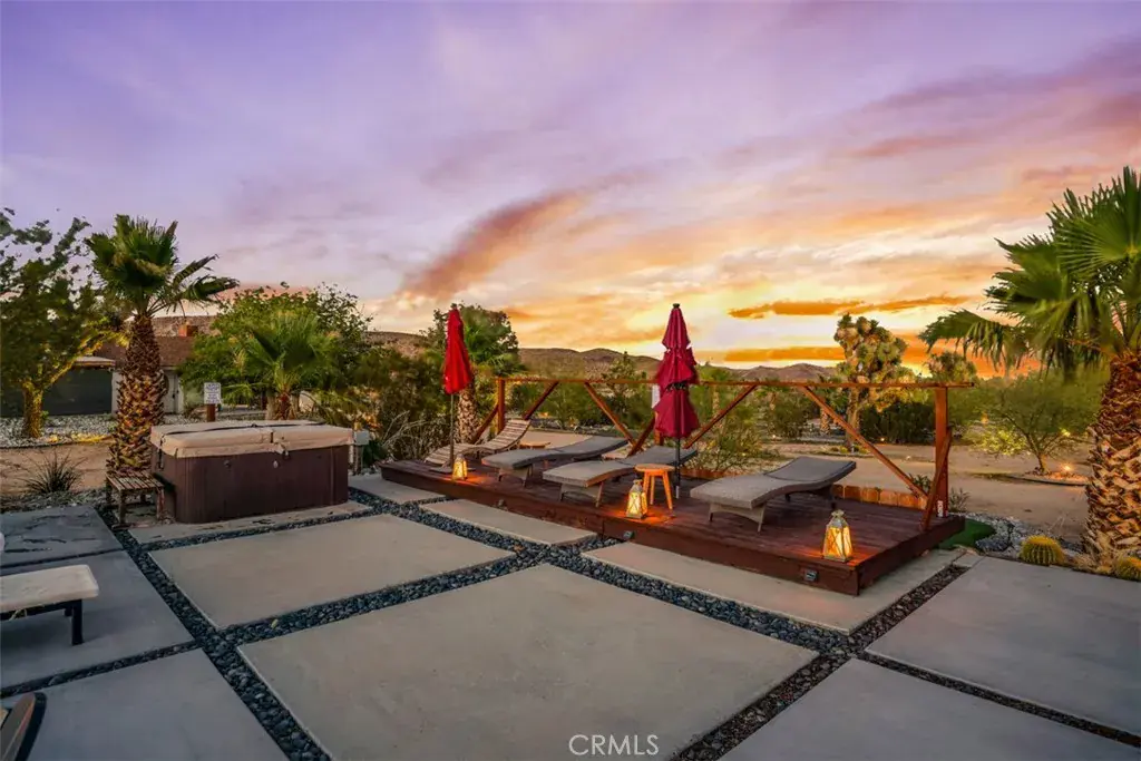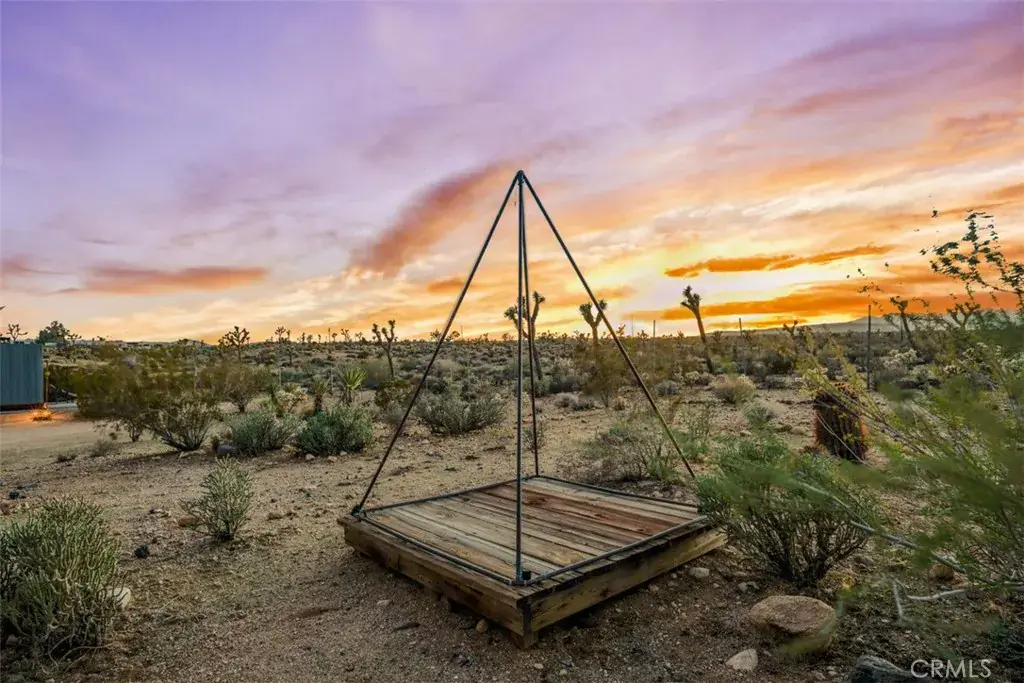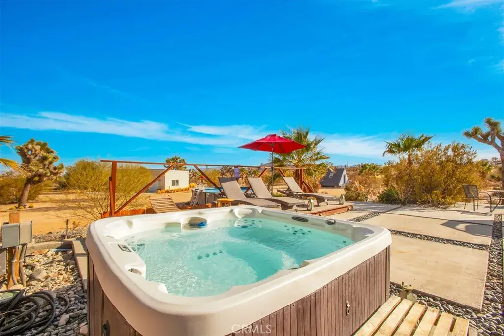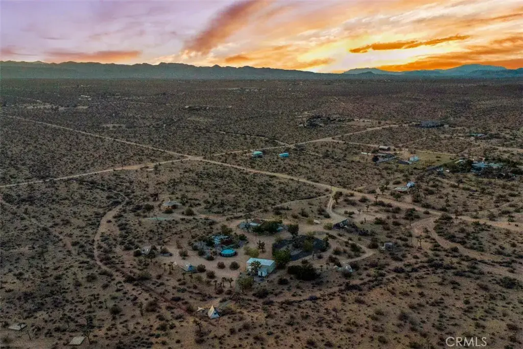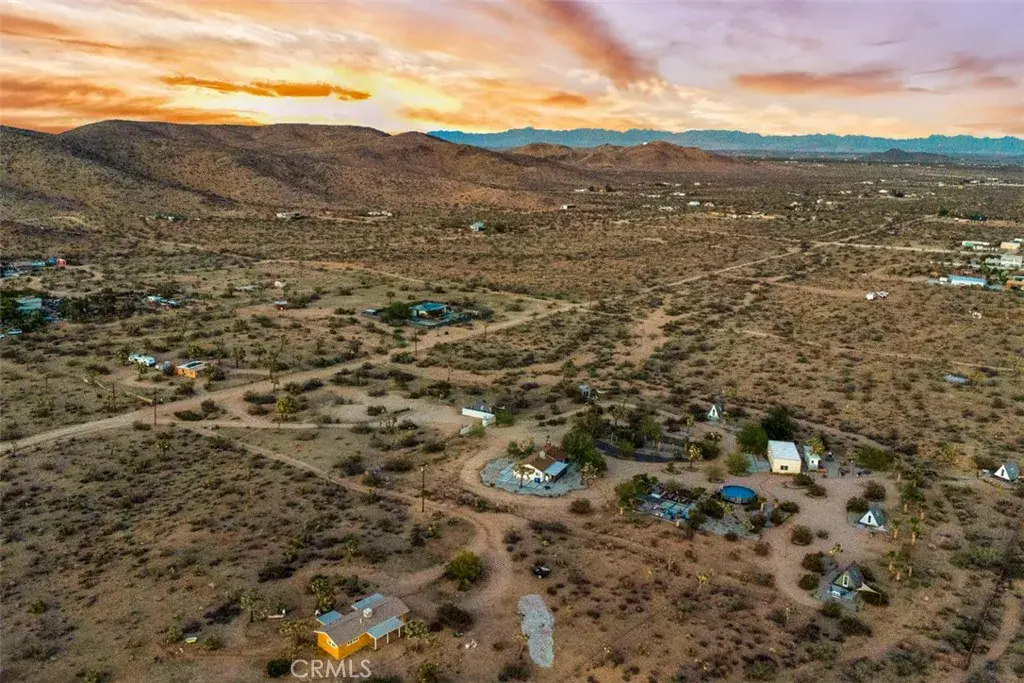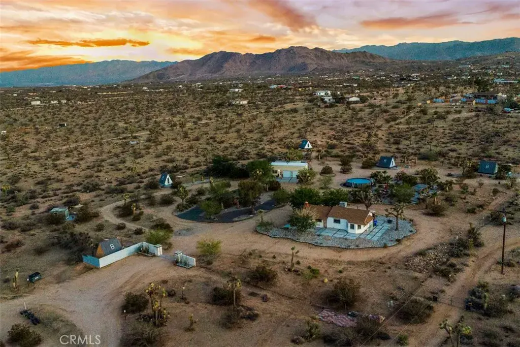 NEW PRICE! Seller is Motived to Sell!! Will provide property revenue upon request! Discover an extraordinary 5-acre income-generating desert retreat minutes from Joshua Tree National Park. This turnkey property combines luxury desert living with a successful boutique glamping business that grossed a significate amount in 2024 and was above the income of 2023. The contemporary main house features vaulted ceilings, natural wood beams, and a gourmet kitchen with expansive granite island. With nine bedrooms and stunning desert views through picture windows, it offers the perfect blend of comfort and natural beauty. A detached studio adds additional living space with its own kitchen, bedroom, bath, and attached garage. The property’s hospitality infrastructure includes six framed structures, one the unique “Tin Can” and one studio apartment. With the right vision a buyer can rent out the house for additional income. Recent upgrades enhance the guest experience with a pool, spa retreat, bocce ball court, and renovated sun deck. Professional landscaping showcases mature palm trees and organically raised Joshua trees throughout the grounds. Multiple intimate spaces for relaxation dot the property, from poolside loungers to private daybeds. Guests can enjoy stunning sunrises, breathtaking sunsets, and stargazing under crystal-clear night skies. Recent improvements include renovated bathrooms, refurbished accommodations, and enhanced outdoor entertainment areas. This turnkey property presents a rare opportunity to own both a private desert sanctuary and a thriving hospitality