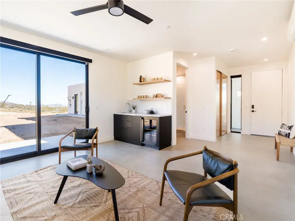 Zoned mini split systems provide efficient heating and cooling, complemented by recessed lighting and modern ceiling fans. Clean stucco walls and low-slope metal rooflines reflect a refined desert modern aesthetic.