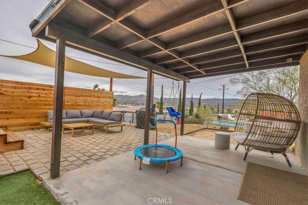 Outdoor living is a highlight, with a covered patio, shaded seating areas, and a filtered stock-tank style dunk pool/hot tub set against wide-open views across Yucca Valley and the surrounding hills. The backyard offers ample space to relax, gather, or further customize while enjoying expansive skies and sunsets.