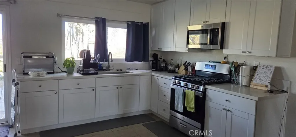 Welcome to this beautifully upgraded 3-bedroom, 2-bath home situated on an expansive lot in the heart of Yucca Valley. energy-efficient double-pane windows, and stylish laminated flooring throughout. The modern kitchen is designed to impress with updated cabinetry, sleek quartz countertops, and newer appliances including a range and microwave, while both bathrooms have been tastefully renovated with tile showers, updated vanities, and contemporary finishes.