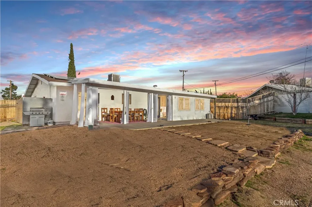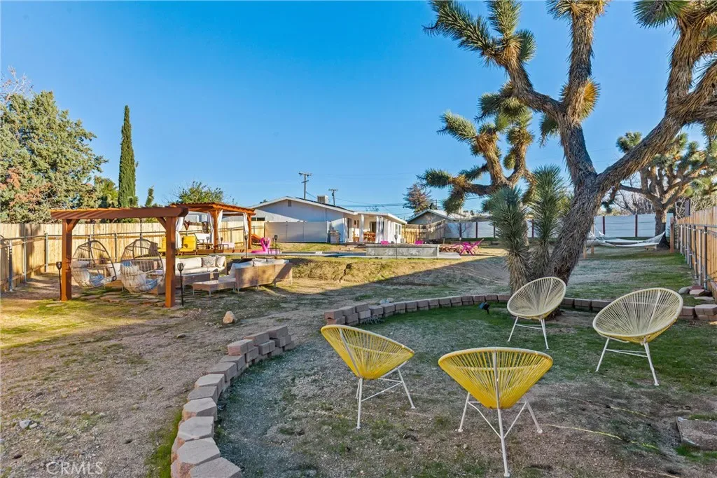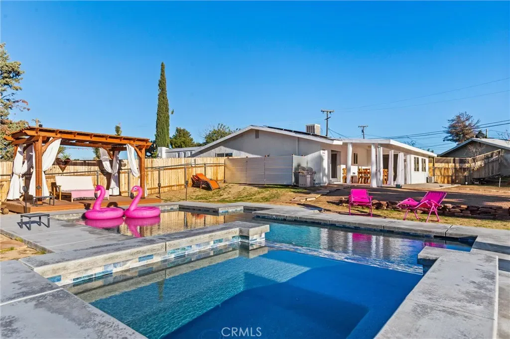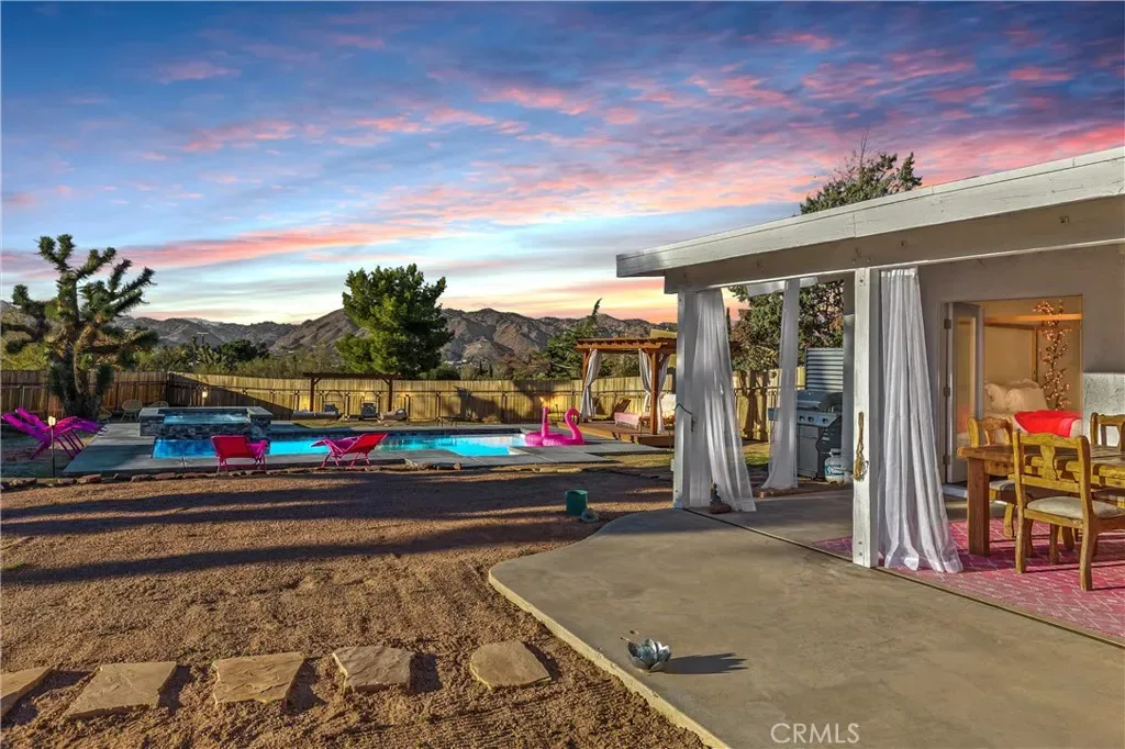 Discover the perfect blend of desert charm and modern comfort in this beautifully updated three-bedroom, two-bath home situated on a generous half-acre corner lot in Yucca Valley’s desirable Storey Park community. Designed with indoor–outdoor living in mind, this home features an inviting open layout with abundant natural light, neutral finishes, and a seamless flow for relaxing or entertaining. The chef-friendly kitchen offers crisp white cabinetry, granite countertops, and stainless steel appliances, while the cozy living area is anchored by a classic fireplace. Step outside to your own private oasis—complete with a sparkling 2022 pool, elevated spa, and a spacious baja shelf perfect for lounging. The backyard is fully fenced and thoughtfully designed with multiple spaces to unwind, including a covered patio ideal for dining, a wooden deck with a stylish cabana for shaded relaxation, and additional seating areas surrounded by Joshua Trees and mountain views. This layout makes it an excellent option for a primary residence, vacation retreat, or short-term rental investment (buyer to verify). Additional upgrades include owned solar (approx. 3 years old), dual-pane windows, central heating and air, a newer evaporative cooler, and a dedicated dog run. Just minutes from Joshua Tree National Park, local shops, dining, schools, and outdoor recreation, this property offers the perfect mix of tranquility, convenience, and desert-lifestyle living.