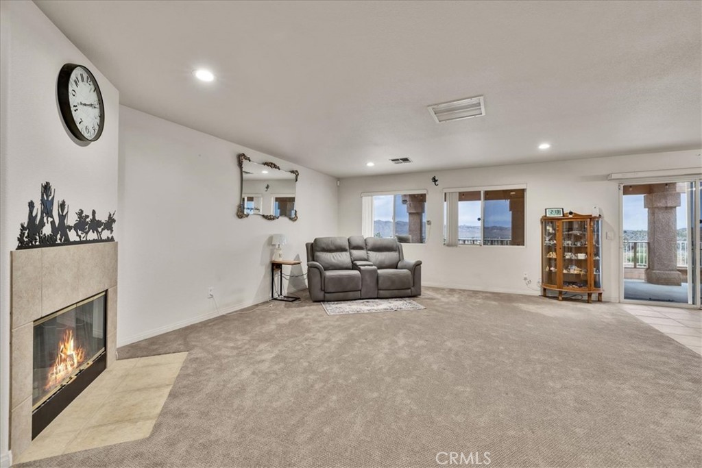 Spacious 4 bedroom, 3 bathroom single-story home positioned on a corner lot with wide open desert and mountain views. The layout offers an open living and dining area centered around a fireplace, with large windows bringing in natural light and views. Kitchen features granite counters, oak cabinetry, breakfast bar seating, and stainless steel appliances, with an open floor plan.