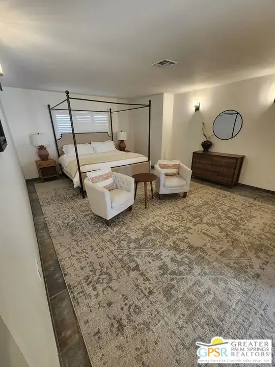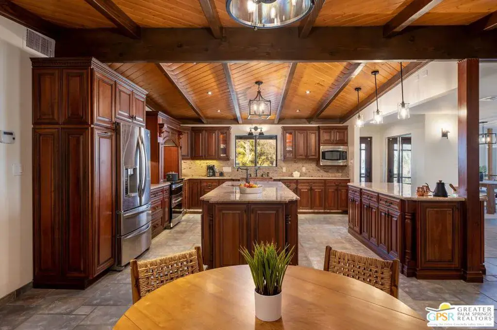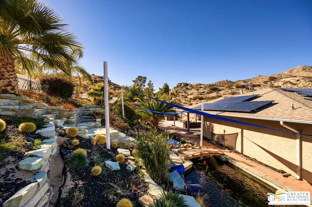 ATTENTION Buyers, The Koi pond has been evaluated and confirmed it can be converted to a pool. We have a new bid in hand. Discover Ridge Oasis, a stunning 3-bedroom, 2.5-bath fully-furnished retreat set against the hills of Yucca Valley’s serene Country Club neighborhood. Perfect as a primary residence, a vacation escape, or a high-potential investment, this fully furnished home blends desert serenity with modern elegance, just minutes from Joshua Tree National Park. Inside, the open floor plan is bright and spacious, with high ceilings and clean modern finishes. The centerpiece is a gourmet kitchen, outfitted with dual islands, two sinks, and premium appliances; it’s a chef’s dream, perfect for family gatherings or entertaining. Enjoy morning coffee at the breakfast nook or host dinner parties in the elegant dining room, with seating for eight, complete with a cozy reading corner overlooking the expansive living area. The living room, bathed in natural light, offers breathtaking desert views through its expansive windows. Avast stone fireplace completes the space, creating a seamless connection to nature. The primary suite is a true haven, offering a sitting area, a spa-inspired ensuite with dual vanities, and walk-out doors to a serene patio – perfect for starlit evenings. Two guest bedrooms share a spacious bathroom with dual zones for privacy. A powder room and full laundry room round out the interior layout. Outside, the gated property invites exploration. Wonder paths lined with palm and Joshua trees, relax by the exotic Japanese Koi pond (which includes complete pool infrastructure for conversion), or stargaze from the upper deck’s sweeping views. The hot tub and spacious entertainment patio make it easy to host and unwind. The home also comes with a three-car garage, a large custom shed, and an upgraded solar system (keeping utility costs low).Just a short drive from local dining, shopping, and hiking, Ridge Oasis offers seclusion and accessibility. Schedule your tour today to claim this desert masterpiece as your forever home!