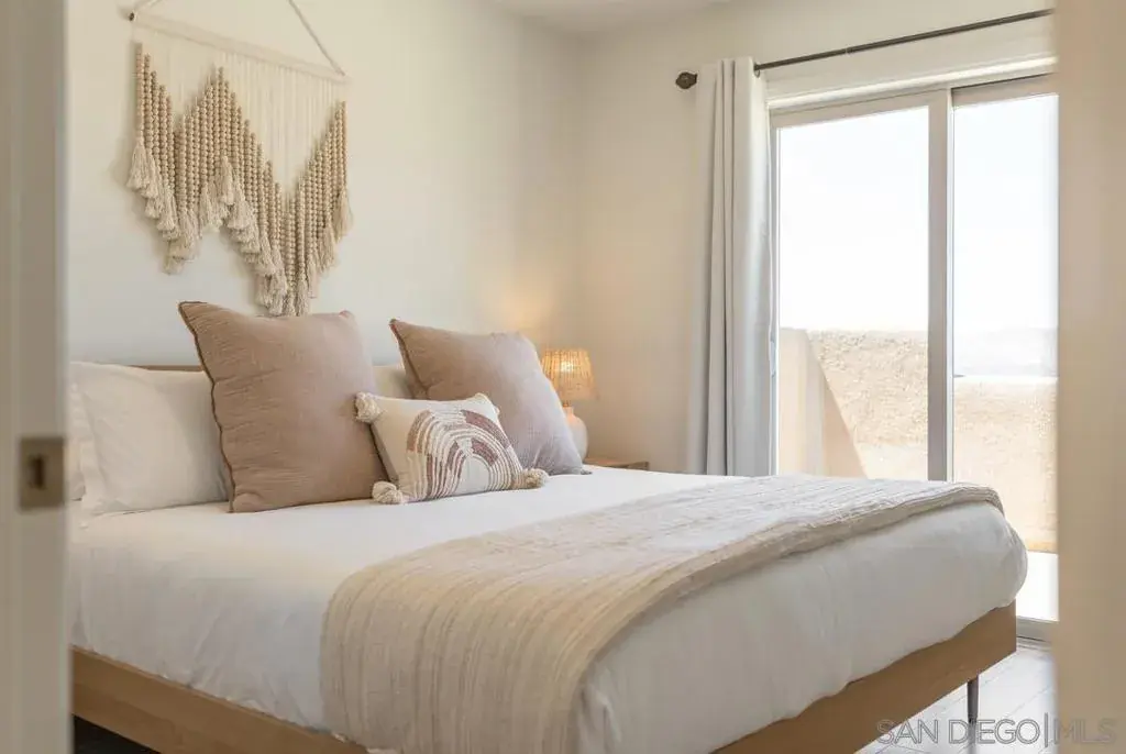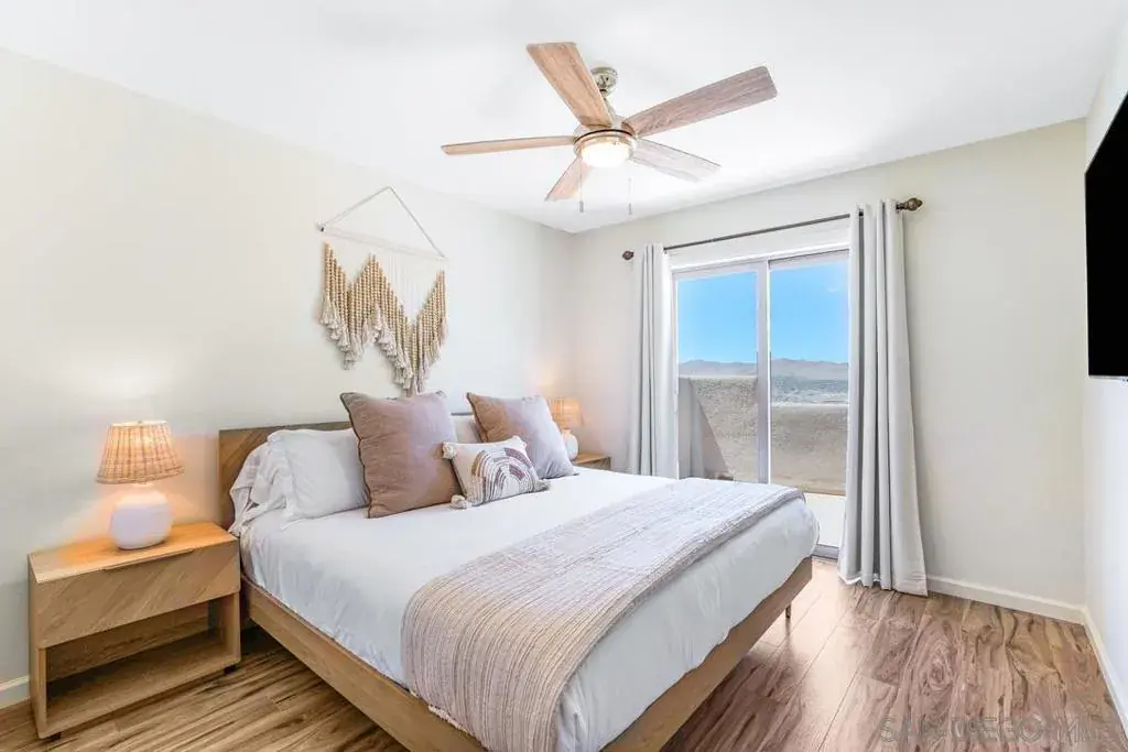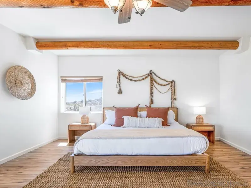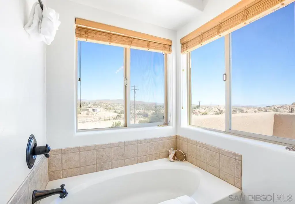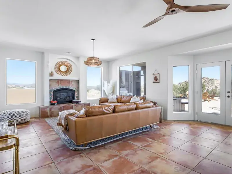 This adobe-style home sits perched on a hill surrounded by boulders. The 360 degree views will take your breath away, especially during sunrise and sunset! This home was completely updated with a classy bohemian style in 2022. This bright and airy home feels like a warm hug! After entering the house through the adobe-style gates, you will find private courtyard. Once inside the home you will find 2 living areas, formal dining, a beautiful kitchen, a half bath and a laundry room. Make your way upstairs to the designated work space located in the common area. Also upstairs is the large primary suite with an ensuite bathroom with sunken bathtub. The highlight of the primary suite is a large private patio with sun loungers. Also upstairs are 2 additional bedrooms and an additional full bath. The two guest bedrooms share a large patio as well.