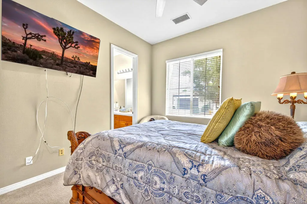 Fantastic opportunity to own in a quiet, gated community where you own the land, a highly desirable feature. This well appointed residence offers an impressive sense of space with soaring ceilings, abundant storage, and generous closet space throughout.Designed for comfortable living and effortless entertaining, the home features open-concept living areas complemented by granite countertops and spacious gathering areas. A bright and inviting sunroom with central air expands the living space and provides the perfect setting to relax while enjoying views of the backyard.Outdoors, the property showcases a beautifully renovated swimming pool with a playa-style lounging area and fire features, creating a private retreat ideal for entertaining or unwinding under the desert sky.The home offers privacy, spacious rooms, and a functional layout designed to accommodate both everyday living and hosting guests. Conveniently located near shopping, dining, and easy freeway access, the community provides both tranquility and accessibility.Adding to the value, the HOA fees are minimal, making this an exceptional opportunity to own in a secure, well maintained community while keeping monthly costs remarkably low.