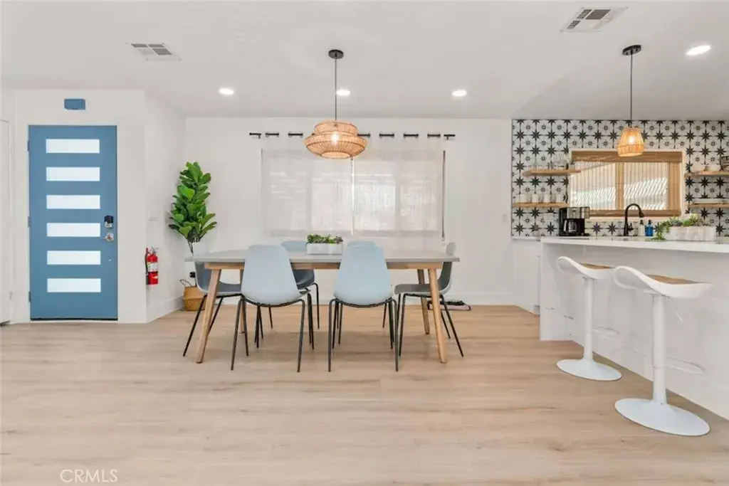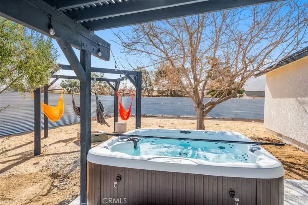 OASIS HOUSE: Meticulously Remodeled & Updated home, including new kitchen cabinetry, quartz countertops, counter-to-ceiling tile backsplash and ALL new appliances. Engineered flooring throughout. Exposed beam in living area, provides the perfect organic aesthetic touch. Both bathrooms are also fully upgrades, with new vanities and floor-to-ceiling custom tile work in the luxurious walk-in showers. The beautifully finished bedrooms feature sublime design details. The garage has been transformed into the ultimate lounge. Entire house is updated with zoned ductless mini-split AC/Heating units for efficiency. Utility room features new washer and dryer. The fully-fenced, private backyard is perfect for children, pets, family and friends and features a cowboy pool, hot tub, fire pit + pergola w/ hanging hammock chairs for socializing and stargazing. Picturing yourself relaxing underneath the palm trees. The legendary 29 Palms Inn is only a short distance away for fine dining and only a short drive to the main entrance of Joshua Tree National Park for hiking and outdoor activities.