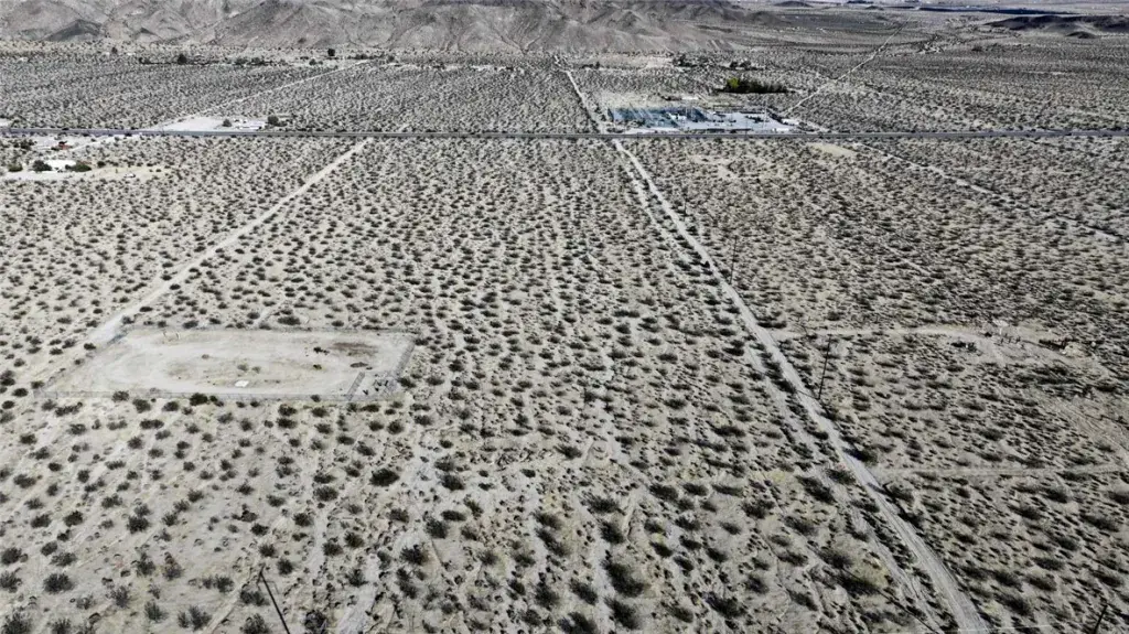 This residential property is referenced near 659904 Dorth Pl, Twentynine Palms, CA 92277 and features level terrain at approximately 2,543 feet in elevation. Overhead electric utilities are available at the lot line, and access is provided by a dirt road.