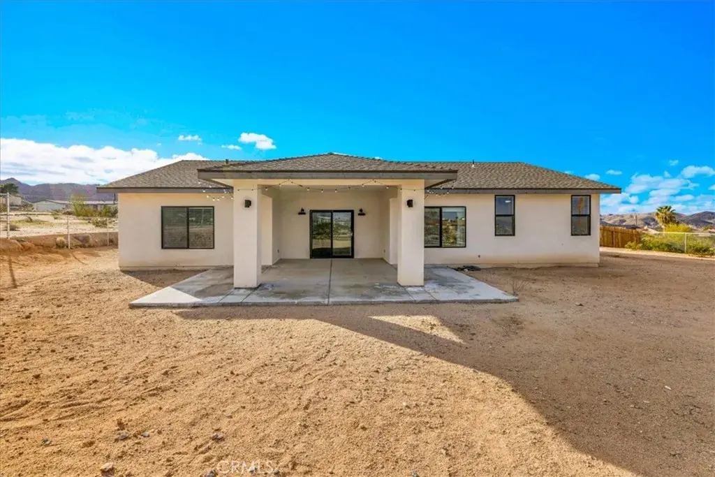 Newer Construction Home! VERY RARE here in the desert, insurance company’s dream! FULLY PAID OFF SOLAR! Your dream home awaits in this nearly brand-new 4-bedroom, 2-bath stunner that blends modern style with QUALITY construction. Built with a well-insulated 2×6 frame and top-of-the-line double-glazed windows, it offers comfort, quiet, and energy efficiency year-round. Enjoy peace of mind knowing everything is fresh and low maintenance, so you can simply move in and enjoy. The light-filled open floorplan features vaulted ceilings, a showstopping kitchen with a massive quartz island and bar seating, and a private split layout perfect for any lifestyle. With luxury LVP flooring, gorgeous tile bathrooms, a spacious laundry room, a huge walk-in closet in the primary suite, and every detail is designed for comfort and efficiency. Ideally located just a hop, skip, and a jump to MCAGCC, Indian Cove Campground in Joshua Tree National Park, the growing downtown scene of 29 Palms, and Joshua Tree, this elevated lot just under an acre offers stunning views and the perfect balance of adventure and ease.