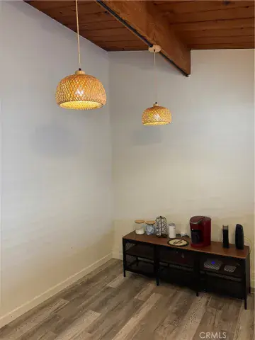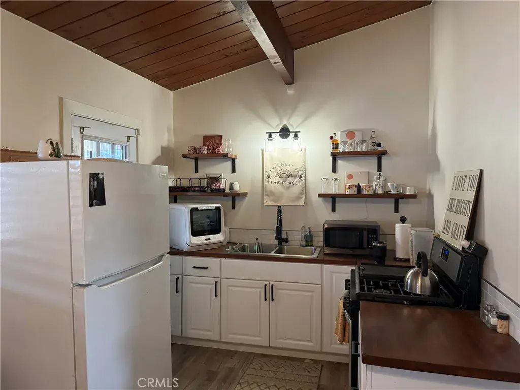 Inside, you’ll find exposed wood beams, an updated kitchen with butcher block countertops, luxury vinyl flooring, and efficient split heating & air systems. The cozy yet open layout highlights the home’s natural light and relaxed desert vibe.