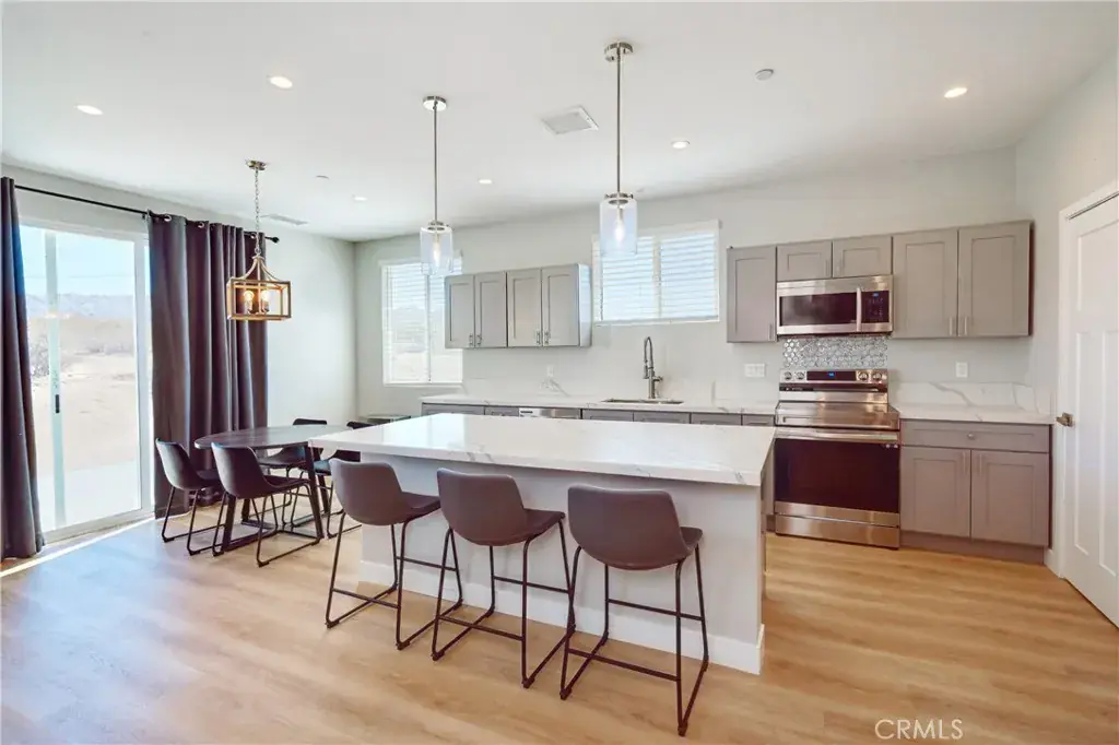 Let the Sun Shine! Modern Retreat in Indian Cove, 29 Palms This stunning 2023-built, 1,857 sq ft contemporary home in Indian Cove, 29 Palms, boasts 4 beds and 3 baths on a 1.1-acre lot with a modern split-level roof design that redefines possible. Step inside to dramatic high ceilings, sleek laminate flooring, and recessed lighting and natural light that flows and enhances the airy ambiance. The home is replete with energy-efficient windows and doors meeting California’s 2020 Title 24 standards. What else? Fully PAID OFF SOLAR SYSTEM to keep utility costs low, paired with enhanced insulation and fire suppression sprinklers to possibly lower the insurance bill and give peace of mind. The open-concept living room and kitchen blend modern design with warmth and comfort. The gourmet kitchen features modern appliances, quartz countertops, ample cabinetry, and a spacious pantry, ideal for entertaining. Bathrooms exude elegance with sleek fixtures and a spa-like serenity while the bedrooms are sunlit sanctuaries with large windows framing dramatic desert views. And what views we have in Indian Cove! Sunlight provides a daily light show both morning and evening. Ample closets and a two-car garage provide storage. This home is Impeccably maintained, with those high ceilings, recessed lighting, quartz countertops and a feeling of elegance, this is the finest home in 29 Palms on the market today. The lovely Indian Cove neighborhood is just 10 minutes from downtown 29 Palms shopping, 15 minutes to the USMC base, 15 minutes to the entrance of Joshua tree National Park and just an hour to the urban amenities found in Palm Springs. And there are hiking trails right in this neighborhood. 29 Palms is growing and the area offers outdoor adventures and cultural vibrancy and continues to be a destination from big cities. This beautiful home would be perfect as a primary residence, weekend getaway, or a solid investment—let the sun shine on your new chapter!