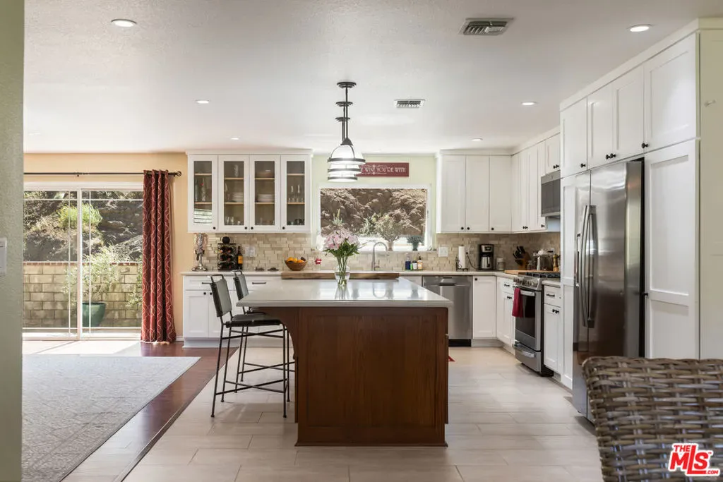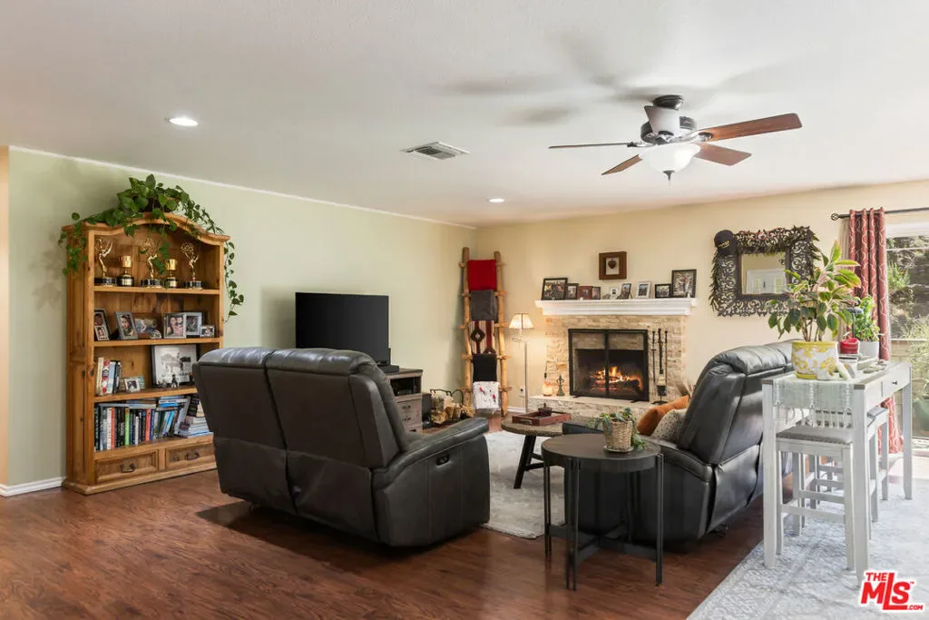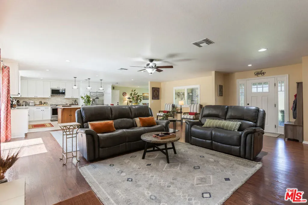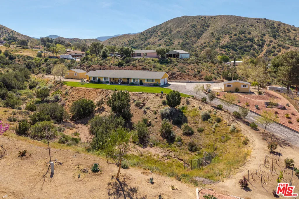 Get that peaceful easy feeling. Welcome to Acton living with plenty of space and stunning natural surroundings. This spectacular remodeled home sits on nearly two acres, tucked privately off its paved cul-de-sac street. The lush green lawn and charming brick pathway welcome you to your own oasis, complete with breathtaking canyon & mountain views. Solar lighting lines the driveway, creating an enchanting approach to this serene country retreat located in one of Acton’s well-established & well-desired neighborhoods. Enter beneath the large, covered patio with lighting, ceiling fans, and heaters, perfect for relaxing day or night. Open the rain-glass embellished front door, into a grand great room where the eye is immediately drawn to the stunning stacked-stone fireplace and the gorgeous, totally remodeled kitchen. New Pergo laminate wood flooring flows throughout the home, enhancing the bright and open feel. The beautifully redesigned kitchen features quartz countertops, bright white cabinetry with soft-close drawers, new tile, new lighting, stainless steel appliances, and a large picture window that frames the outdoor scenery. A versatile bonus room just off the kitchen offers the perfect space for a formal dining room, office, playroom, or creative studio. Freshly painted, and truly move-in ready, the home offers four spacious bedrooms and three updated bathrooms, providing plenty of flexibility for family, guests, or work-from-home living. The remodeled primary suite feels like a private retreat with its own electric fireplace, double closets, and a sliding door that opens to its own brick patio with quiet views. The updated bathrooms feature granite countertops and shower/tub combinations, with one bathroom offering heated floors for added comfort. Outside, the meticulously landscaped grounds showcase mature trees, colorful annuals, and generous space for entertaining or simply enjoying the tranquility. The property also features RV parking with two sets of hookups, garage with its own workbench area, and bathroom with mud sink, multiple outbuildings for workshops or storage, and abundant outdoor parking. Additional highlights include city water, natural gas, underground utilities, septic system, water softener, and a 7.5 kW roof-mounted solar system (lease to be assumed or paid off in escrow). Classic Acton, “Of Course”.