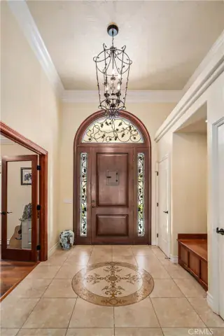 Situated on 9.87 acres, this Acton property showcases a double-stucco “Old World Style” exterior and a million-dollar view. A large covered patio provides the perfect setting for outdoor dining, entertaining, or simply enjoying the scenery. The attached 1170 sqft., 4-car garage is double insulated, offering added comfort and efficiency. The home is accessed through an impressive fiberglass front door, setting the tone for the quality craftsmanship found throughout the property.