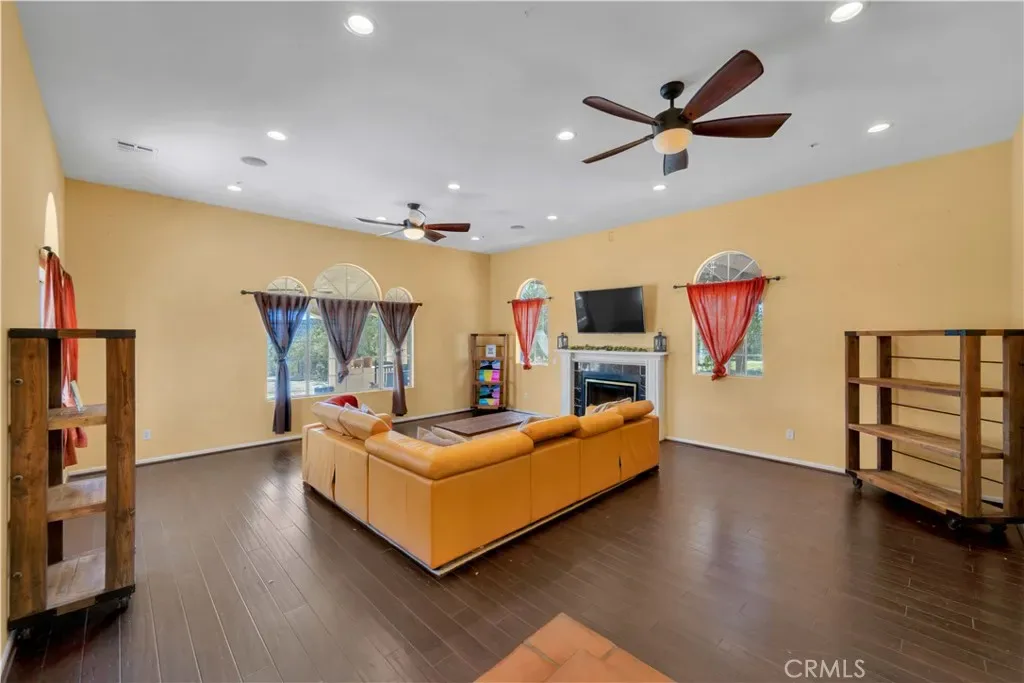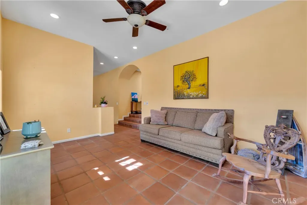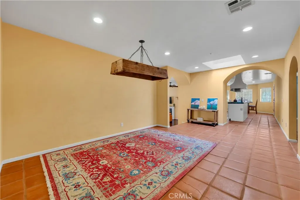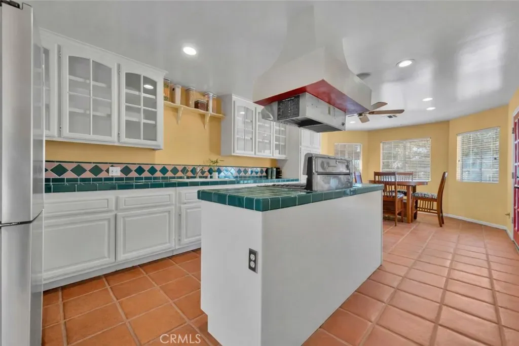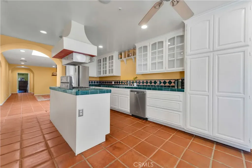 Inside, the home welcomes you with a large living area featuring rich wood flooring, abundant natural light, and a cozy fireplace that anchors the room. Multiple arched windows frame views of the surrounding landscape while creating a bright and inviting atmosphere ideal for relaxing or gathering with family and friends. The kitchen offers generous cabinet storage, white cabinetry, tiled countertops, and an oversized center island with cooktop and custom hood. Terra-cotta style tile flooring and open flow into the adjacent areas make this space both functional and warm for everyday cooking or entertaining. The primary suite provides a spacious private retreat with plenty of room for a sitting area and direct access to a beautifully designed ensuite bathroom. Additional bedrooms are comfortably sized with ample closet space and share well-appointed bathrooms.