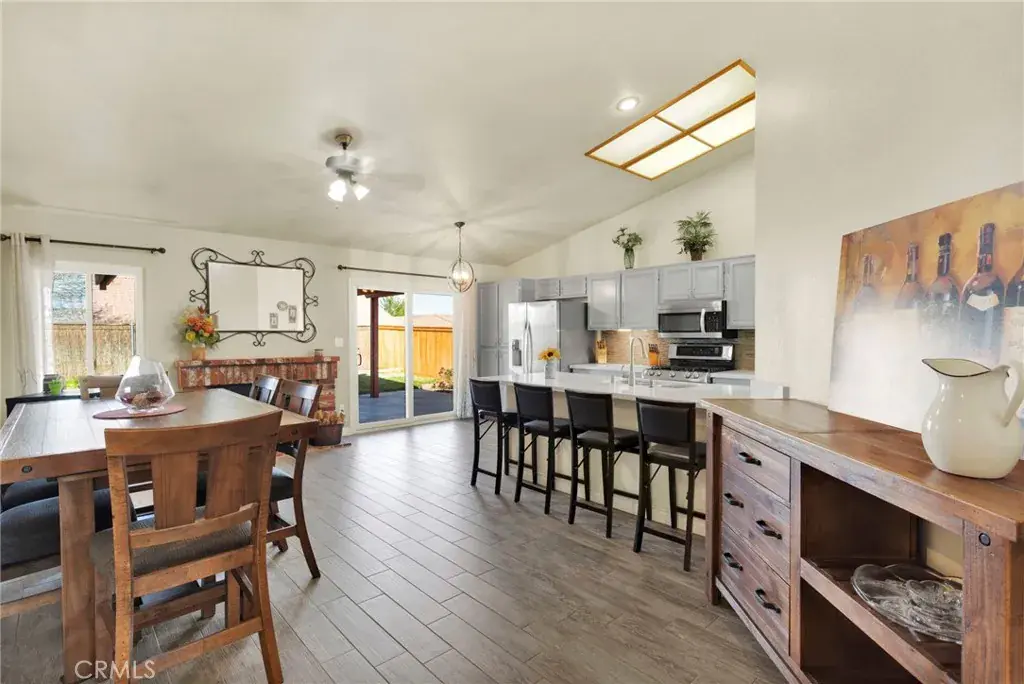 The layout includes four bedrooms, two baths, and approximately 1,671 square feet of well-designed living space, along with a three-car garage. The kitchen features quartz countertops, a breakfast bar, updated cabinets, and appliances that include the refrigerator. Vaulted ceilings and large picture windows bring in natural light and create an open feel. A formal living room is complemented by an open family room, dining area, and kitchen, making the space comfortable for everyday living and gatherings.