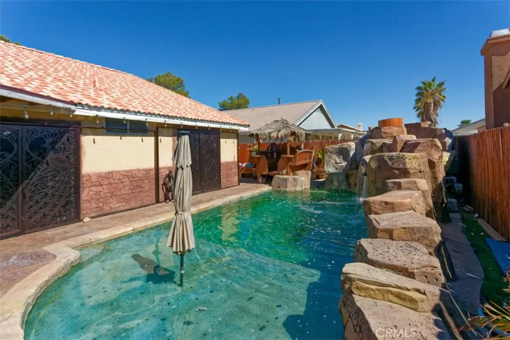 Beautifully maintained POOL HOME in the city of Adelanto, conveniently located near Highway 395, offering excellent access for commuters. The property is fully enclosed with a custom fence and features extensive concrete work throughout. The backyard is a true highlight, showcasing a SPARKLING POOL with a custom water slide, waterfall feature, an outdoor shower/bathroom, and an impressive concrete bar with built-in bar stools and cabana—creating a private, resort-style oasis perfect for entertaining or relaxing. Inside, the home offers four spacious bedrooms and two full bathrooms, along with a welcoming living room featuring a cozy fireplace. Security doors provide added peace of mind and privacy. This unique property offers a rare blend of comfort, functionality, and outdoor luxury—an exceptional opportunity that won’t last long.
