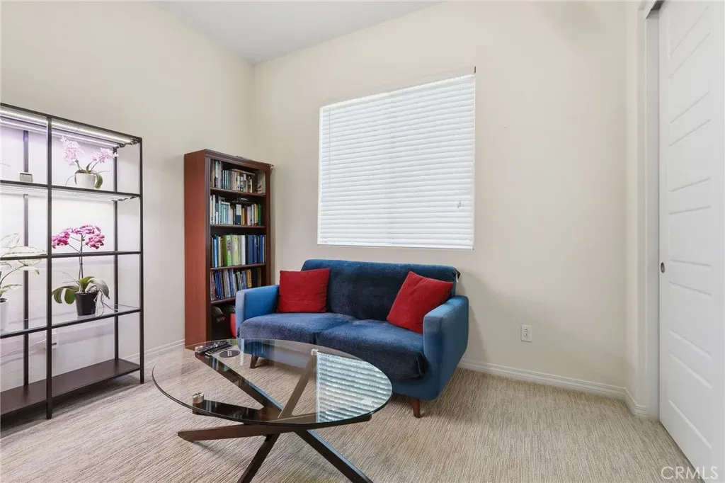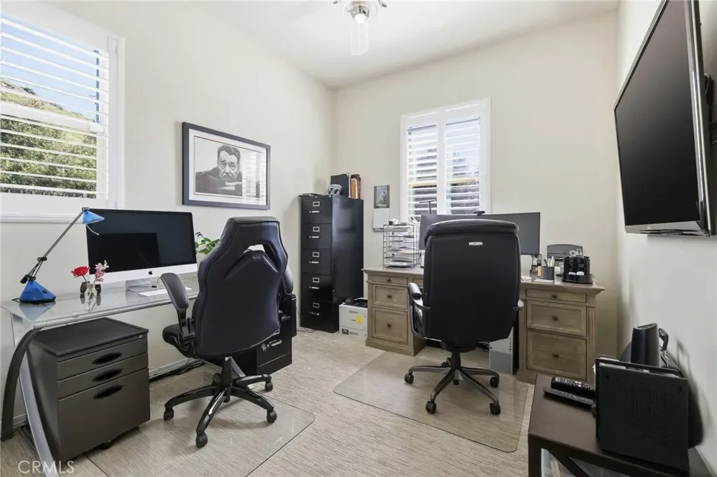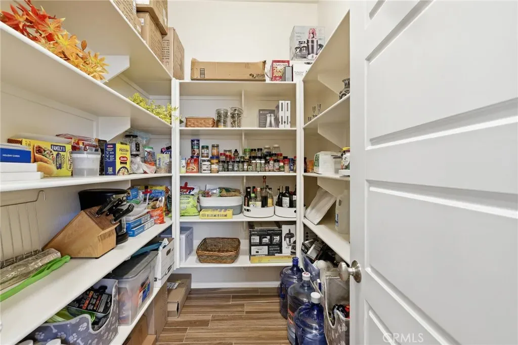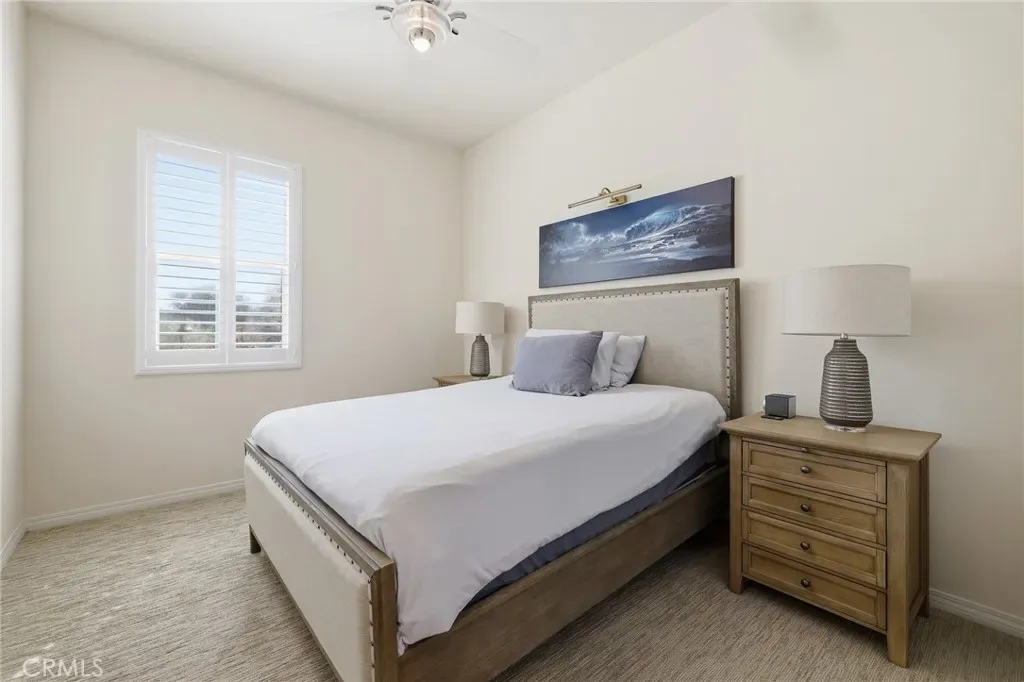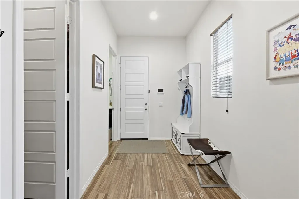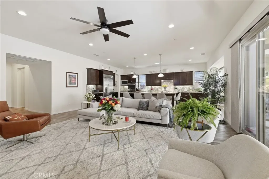 Enter through a welcoming foyer into a light-filled open layout designed for seamless indoor-outdoor living. Lofty vaulted ceilings and gleaming wood-look porcelain floors create an airy feel throughout. Oversized sliding glass doors frame lush surroundings while custom plantation shutters add a refined touch.