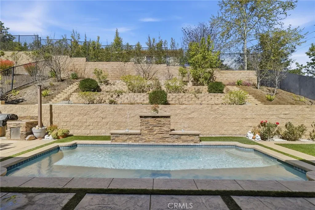 Step outside to a private backyard retreat featuring a sparkling saltwater Pebble Sheen pool with cascading waterfall. The outdoor space includes lush artificial turf pathways, tiered planting beds, and a covered patio with ceiling fan and TV, perfect for outdoor dining, relaxing, or entertaining. Enjoy the built-in grill, personal putting green, and a fun oversized chessboard. A dedicated pet run adds additional convenience.