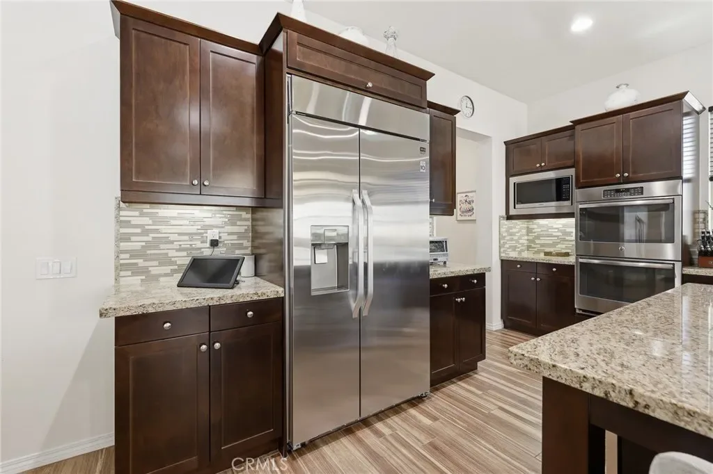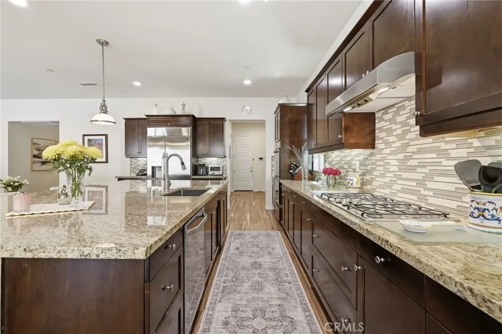 At the heart of the home is a gourmet kitchen featuring premium stainless steel appliances, extensive cabinetry, a spacious walk-in pantry, and a massive center island ideal for cooking, gathering, and entertaining. The kitchen flows effortlessly into the living and dining areas, creating the perfect setting for both everyday living and hosting guests. The home also includes a dedicated laundry space with utility sink, generous counter space, and additional storage.