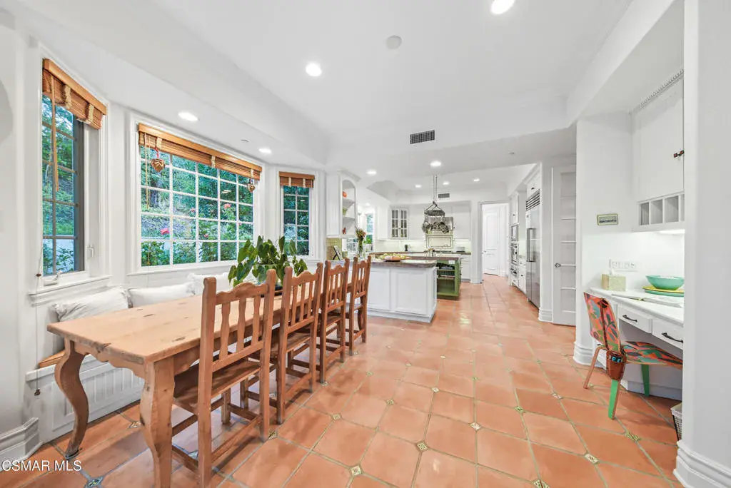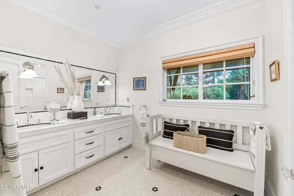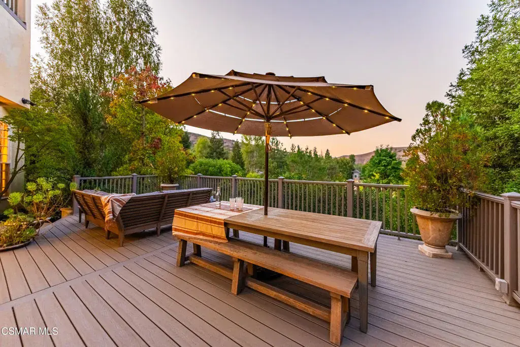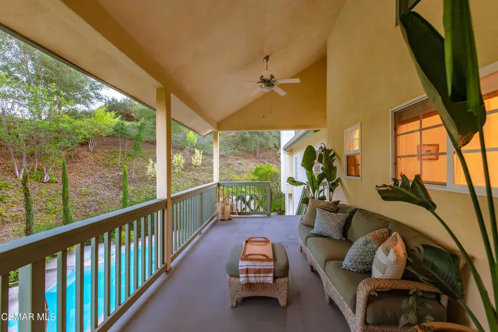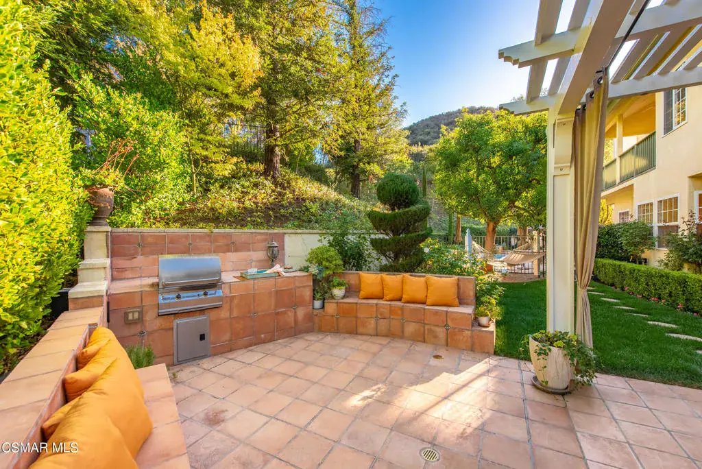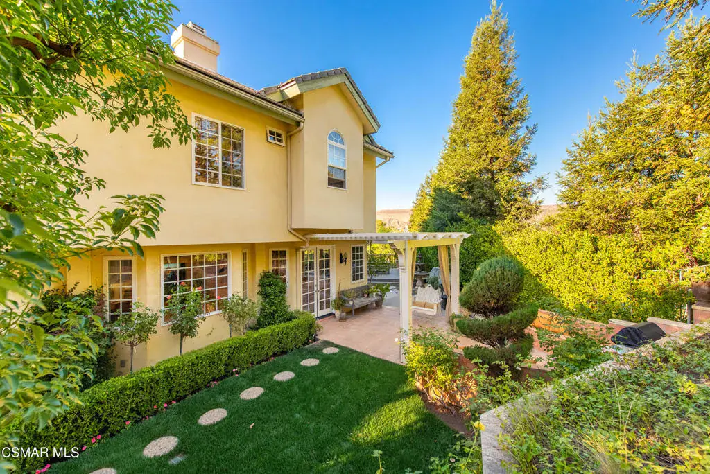 Elegant Country French Estate in Prestigious Medea Valley nestled atop a privately gated knoll. Masterfully built with the finest materials including designer tiles from famous Mission Tile Co. Sweeping mountain and valley views are the backdrop to classic elegance with modern amenities. The community security gate ensures exceptional privacy and a peaceful retreat. Upon entry, you’re greeted by soaring ceilings and expansive windows in the Formal Living Room, while the spacious Dining Room features a graceful bay window ideal for entertaining. The heart of the home is the open-concept Family Room, Kitchen, and Breakfast Nook. The gourmet Kitchen includes a prep island, Viking appliances, walk-in pantry, white cabinetry, and generous counter space. The sunlit Family Room offers a built-in entertainment center, fireplace, and French doors leading to a charming patio with built-in BBQ. A downstairs Bedroom with custom office cabinetry provides a flexible workspace and a private bath. Upstairs, the luxurious Main Suite features a fireplace, sitting room with private veranda, dreamy walk-in closet, and a spa-like bath with soaking tub. French doors open to a large balcony that overlooks the pool and serene mountain vistas. Completing the upstairs are 3 additional bedrooms and two well-appointed baths plus an amazing 500 sq ft Bonus Room with fireplace and private exterior entry. The beautifully landscaped grounds include a private orchard with apple, peach, plum, and lemon trees, a pool and spa, expansive deck with beautiful views and a park-like playground. Recent upgrades include a new HVAC system and remodeled pool with new equipment.Additional highlights: Oversized three-car garage with custom cabinetry, 108 sq ft potting room/studio or storage, EV-ready with separate meter and hookup.Private community access to hiking trails in the Santa Monica Mountains Preserve and Paramount Ranch. Medea Valley Estates is just five minutes from the 101 freeway and offers convenient access to schools, fine dining, wineries, shopping, and Malibu beaches. A rare blend of privacy, luxury, and location–this custom-built estate is truly one of a kind.