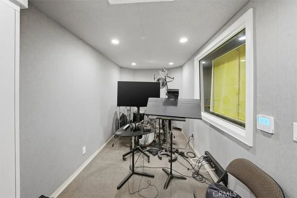 The lower level offers exceptional versatility, featuring a professional recording studio and sound booth — ideal for music, podcasting, or creative production — along with an additional bedroom or office. A separate one-bedroom guest suite with its own living room and bath provides flexible space for guests or multi-generational living.