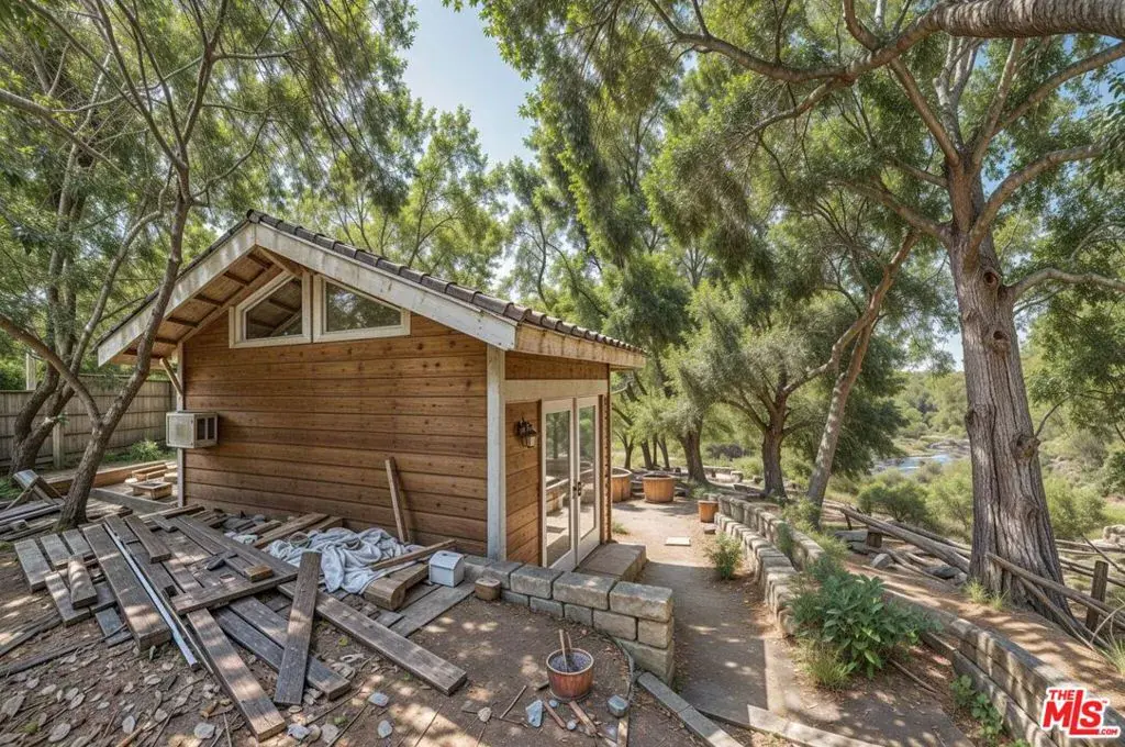 Stream side. Choice of dock site. Woolsey Fire Burn out. Owner has started the process for plans. Previous home had attached ADU. Serene and eclectic Malibou Lake with community lifestyle. Island fun, fishing and boating, huge clubhouse, community dock, swimmers pool with poolside seating areas, lighted tennis courts, basketball, softball, park and picnic areas, local gardens. End of cul-de-sac location on private gated street. Go directly to the Paramount Ranch Park. Art studio and landscaping hut.