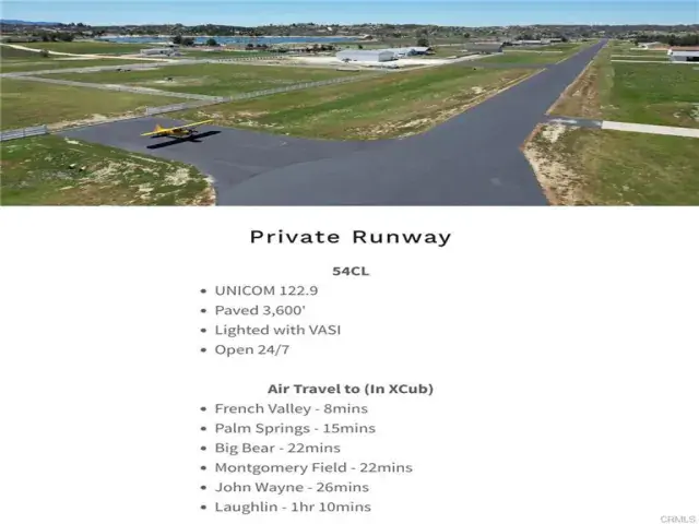 AVIATION RUNWAY AND EQUESTRIAN ACREAGE. RARE and INCREDIBLE SoCal Property: Lot 330 On PAVED Sky Harbor in the beautiful Lake Riverside Estates Community. Enter the gated 2.69 ACRE Fully Fenced parcel offering a new PRIVATE DEEP WATER WELL WITH ELECTRIC AND PRESSURE TANK. AND THE BEST PART………………DIRECT TAXIWAY ACCESS TO the 3600′ lighted RUNWAY with VASI system. BONUS ******* COMING SOON, ADJACENT COMBINED 5+ ACRE CUSTOM MODERN BUILT STYLISH HOME WITH AIRPLANE HANGAR******* This gorgeous mountain view parcel also offers planted trees lining the property including pines, mulberries and mimosas!! Located in the heart of wonderful SoCal with mild seasonal temps and higher elevation with clear skies above the hustle of the city down below. This developed parcel is located on a paved road, is completely level, and with exception to building setbacks from the edges, it is all usable and ready for your dreams. Build your private Hangar “AND” Horse Barn, custom home, gardens, and more! Located only 25 min from Temecula for shopping and dining and approx 30 min to Temecula Wine Country. Within 45 min you can enjoy Palm Desert, Idyllwild and Julian. This gorgeous community offers a 55 acre lake for bird watching, catch and release fishing, dog walking, picnics, and BBQ areas. There is a tot lot, pool, meeting/rec room, bike pump track, sports courts, and direct access horse and hiking trails in the adjacent National Forest! The community equestrian arena is a quick 2 min ride from the parcel and the lake is only a few minute walk away! This type of real estate is quite rare throughout the US but this historic aviation and equestrian community offers it ALL!!! The local pilots have created a supportive Pilot’s group where likeminded enthusiasts get together and plan great fun events like Santa Fly in, air and car shows, and runway improvements. Many types of construction are allowed, and the owners recently built their own custom home and they are happy to share information on the process. A must see for the aviation (and equestrian) enthusiast!!