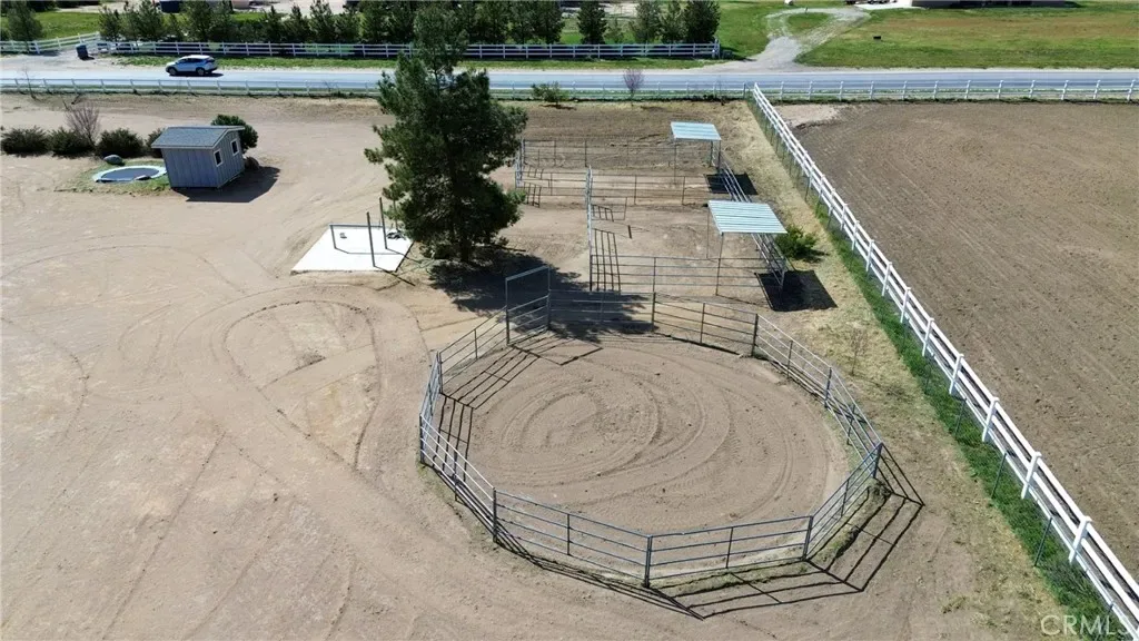 The property is fully fenced and well suited for a variety of uses including equestrian, recreational, or hobby farming. Existing features include horse corrals, a round pen, and a chicken coop, offering flexibility for those looking to utilize the land.