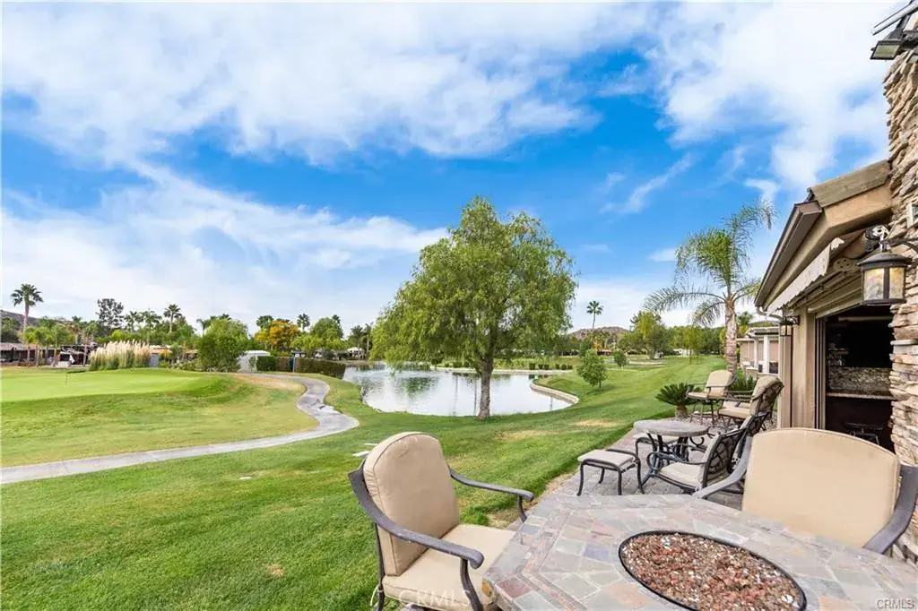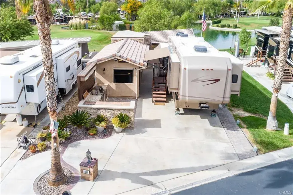 WOW!! This is the one… This lot has so much to offer, for sure a must see on your tour of the Resort. Let me start at the front of the lot, beautiful curb appeal with Palm Trees, Built in BBQ with storage and a Retractable Awning for extra protection or shade. Step inside through secure lockable doors to approx 750 sq ft buildout to a Full Kitchen w/ Granite Counters, Residential Stainless Steel Frig, Stove and oven. So much counter space & storage for your stuff that you need to cook and clean, moving out of the kitchen into the Dining & Family Room area all Stained Stamped Concrete looking out onto the Golf Course & Pond thru Double Screens for privacy and protection from the elements. There is a patio to watch the Golfers and take in the Sunset with the protection of a Retractable Awning and a Fire Pit for warmth and comfort. One last area to enjoy is the entertainers area with an Island with two small frigs for wine, sodas and beer, this area even has a sink for extra cleaning and fun. Next to this is the Washer and Dryer tucked away and only seen when needed. Included in Rancho California RV Resort is a 14 hole Executive Golf Course that is free for owners, 5 Pools and Jacuzzi areas, Tennis Courts, Pickle Ball Courts, Laundry Rooms, Dog Park, Horse Shoe Lawn, Club House, Hiking Trails, all inside Gated Community that is Guarded 24/7. You can live here or rent your space. Peace and quiet serenity all just 25 minutes from Temecula Wine Country. No age restrictions. Financing Available….